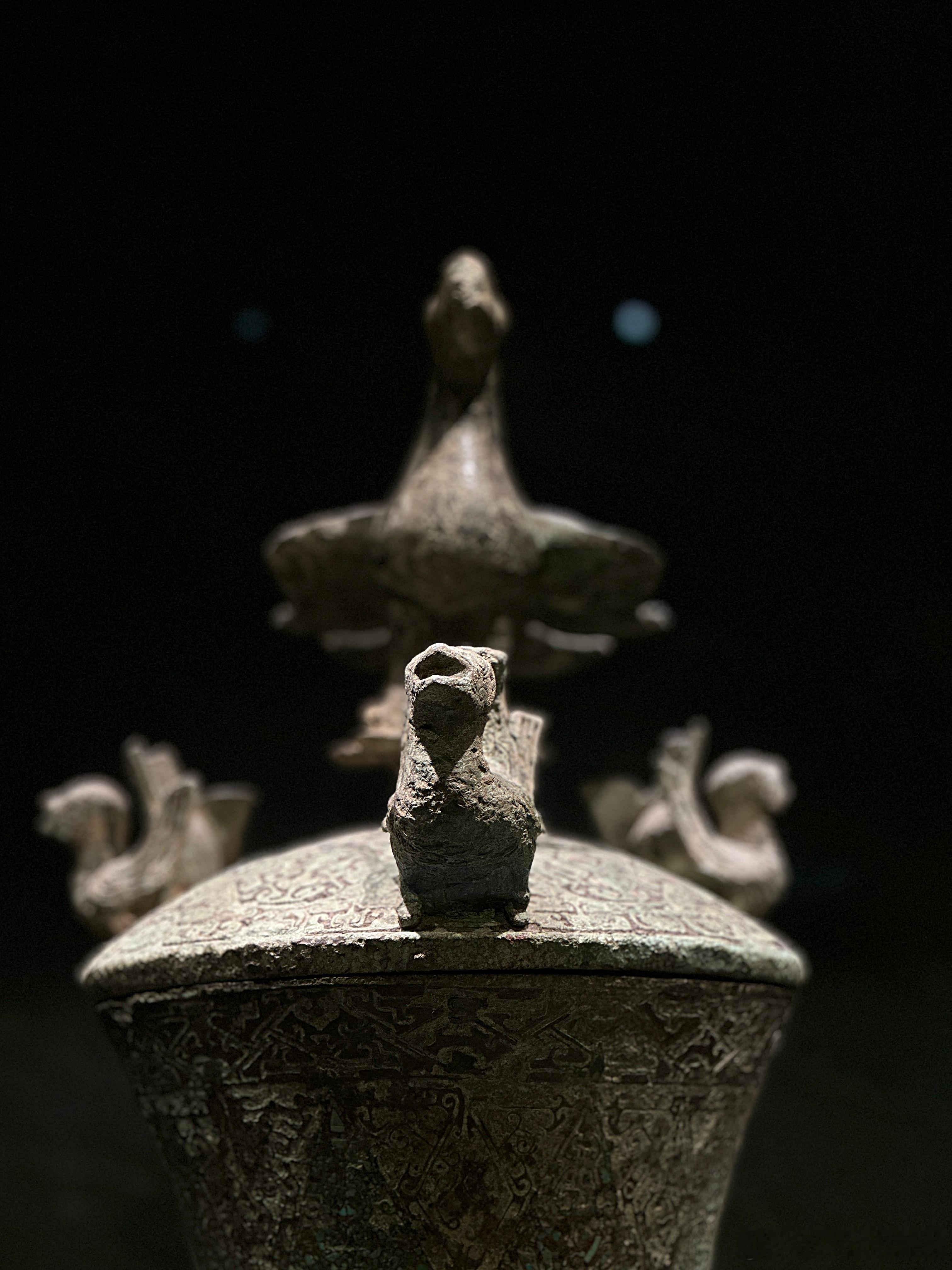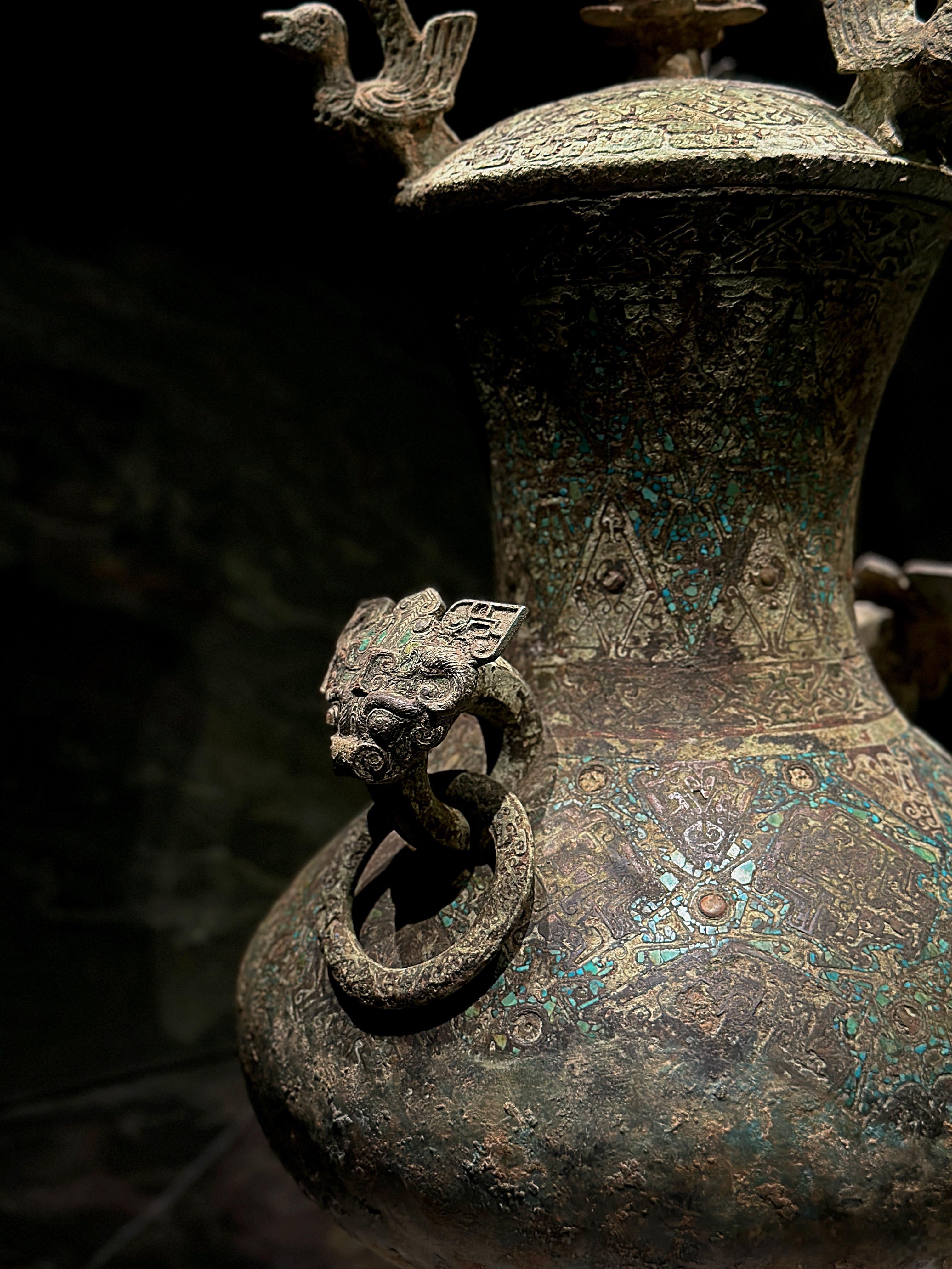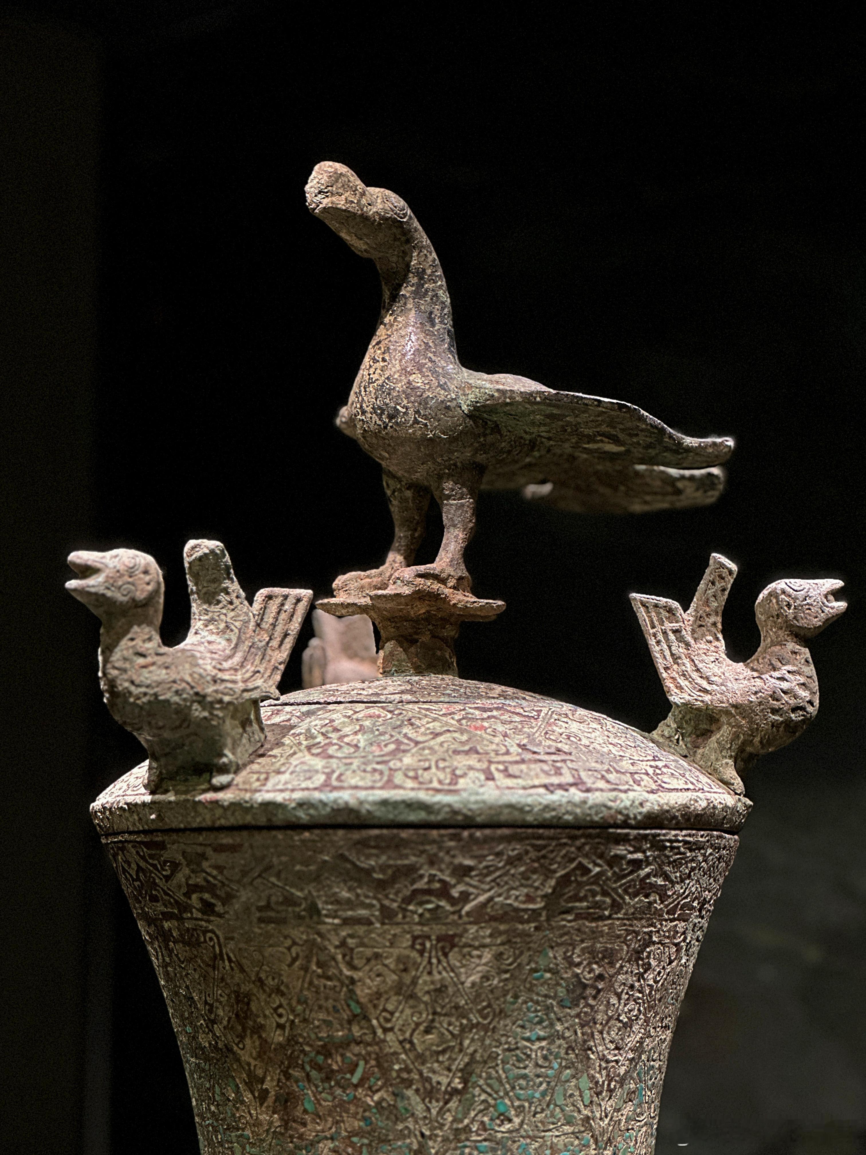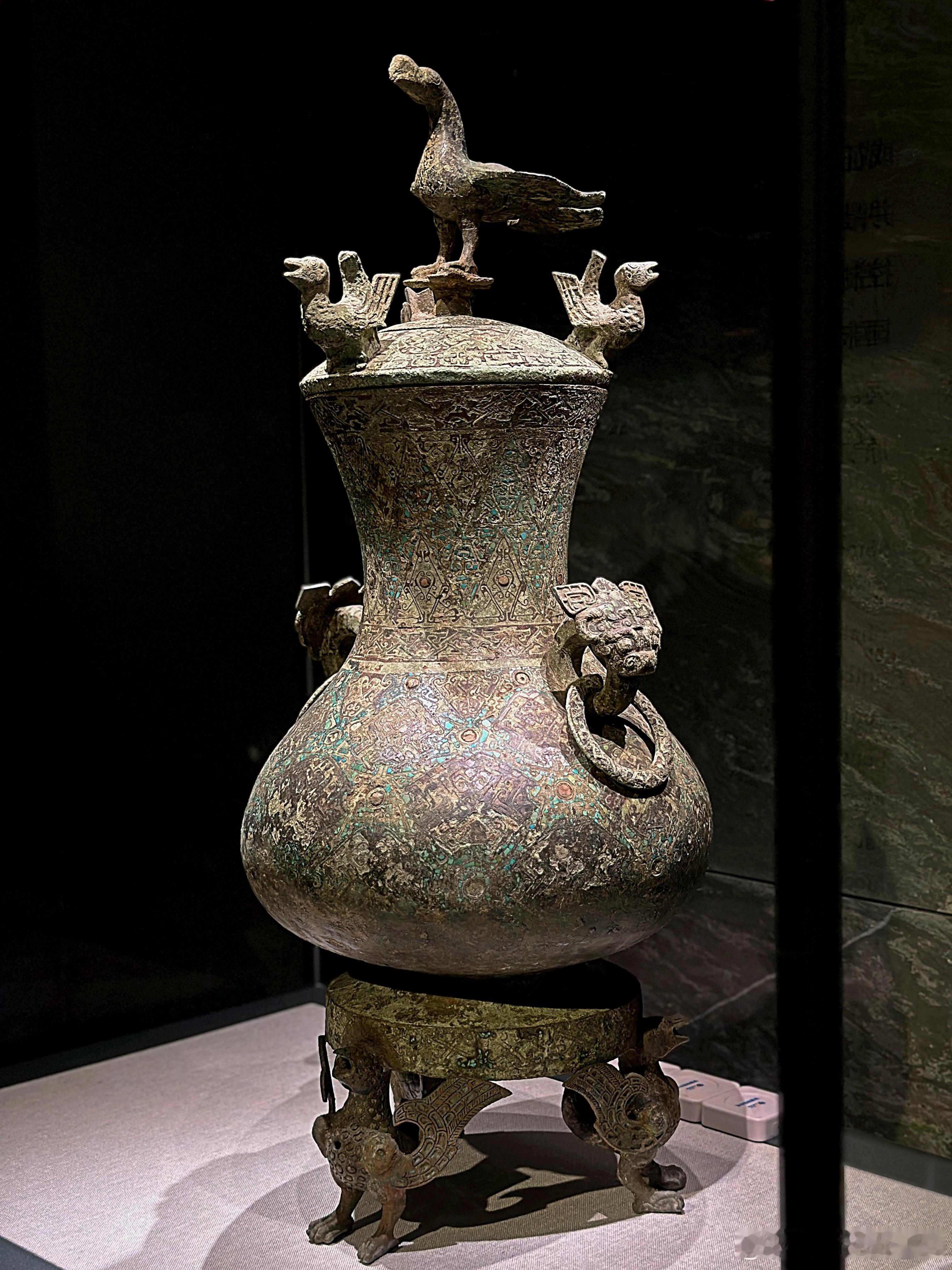 青铜错金银立鸟几何纹壶战国晚期南京博物院藏1965年江苏涟水三里墩西汉墓出土。通高63厘米、口径19厘米。壶体表面饰错金银,间嵌绿松石。此壶为战国晚期新出现的将镂刻、错金银、嵌玉镶珠、鎏金银等多种金属工艺融为一器,构思奇巧。盖、底均饰立鸟。盖中部隆起的壶边缘,蹲踞三对展翅欲飞的雏鸟,口微开,似鸣叫。壶盖中心有一圆孔,上加浮盖,浮盖上有五瓣梅花式钮,钮之顶端站一只双翅舒张、引颈高鸣的鸿雁。壶底以三鸟作器足,鸟形象生动,鸟爪扣地,鸟身后倾,双翅上扬。