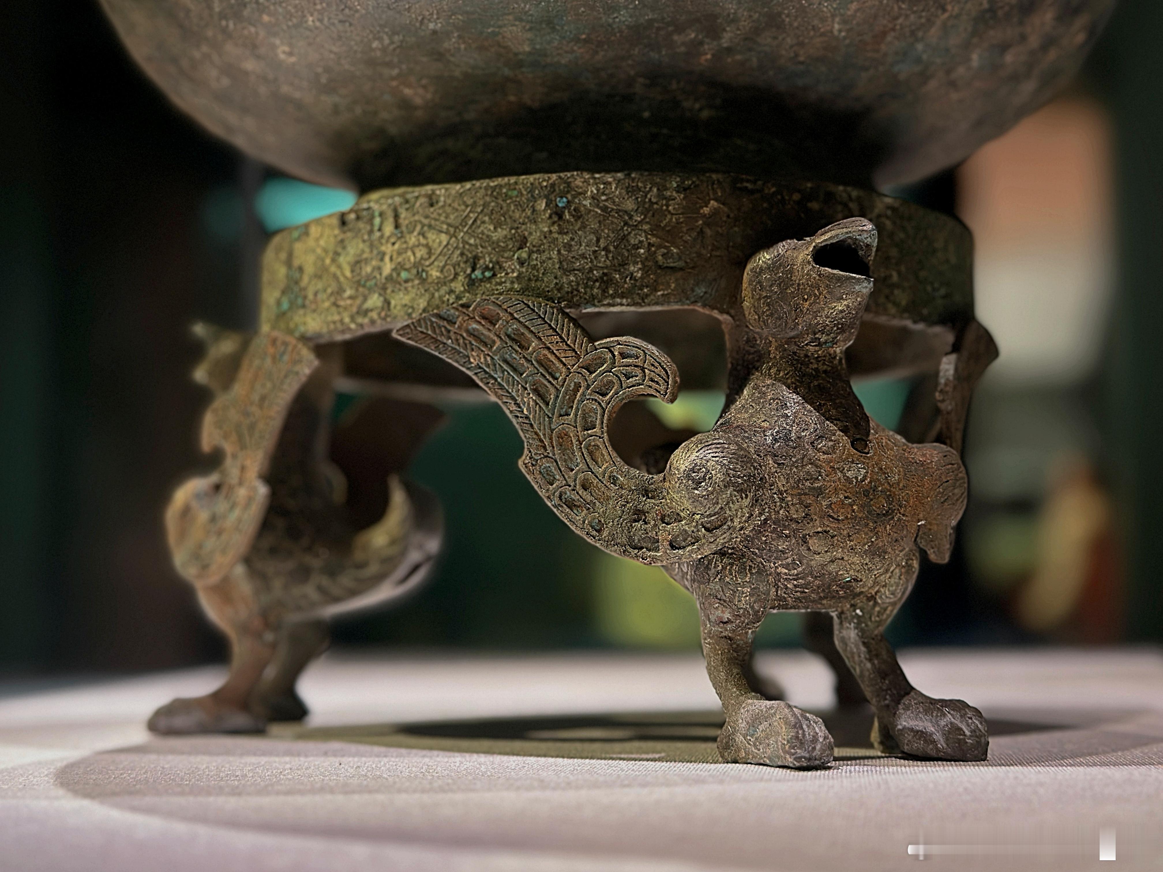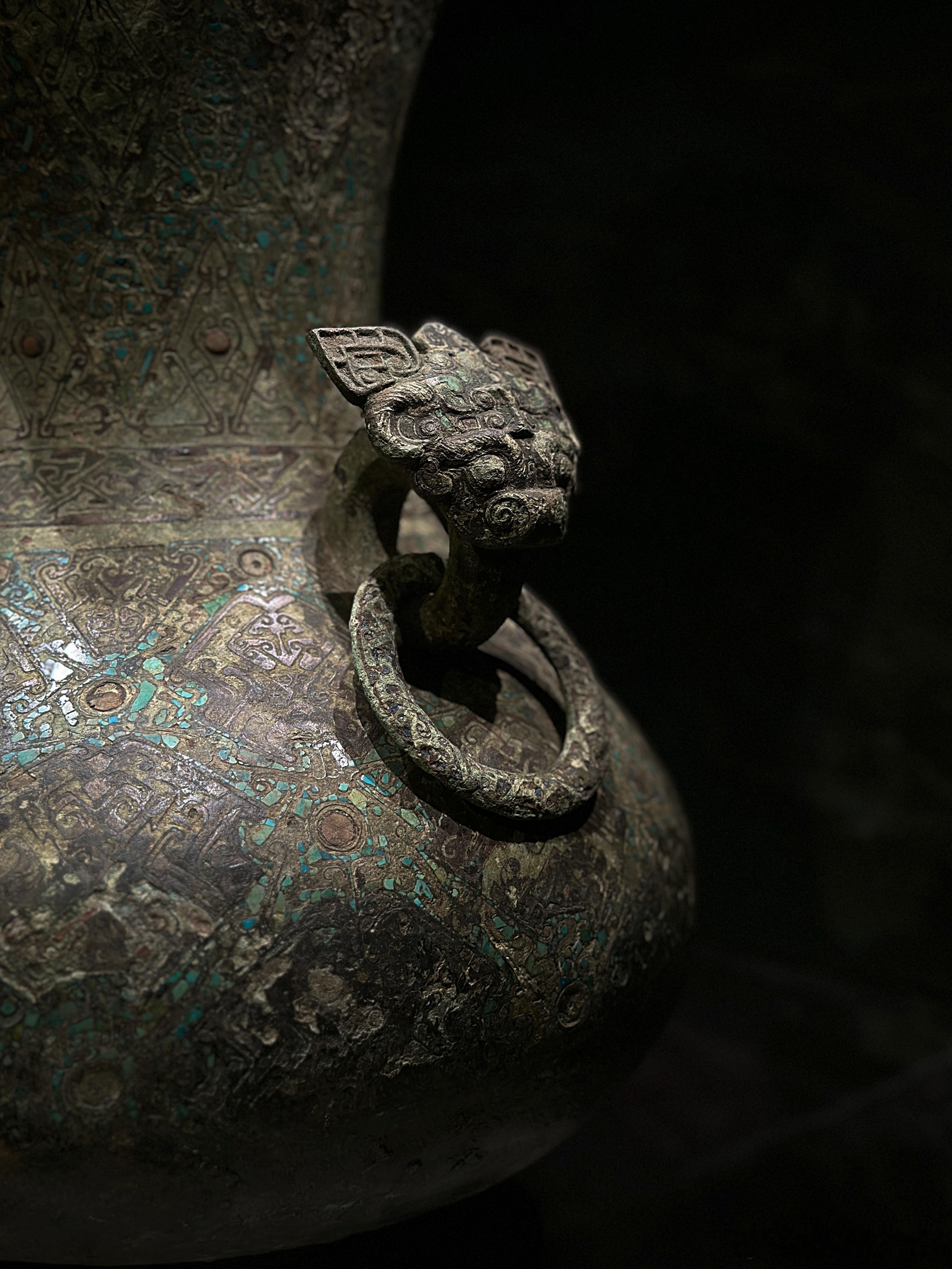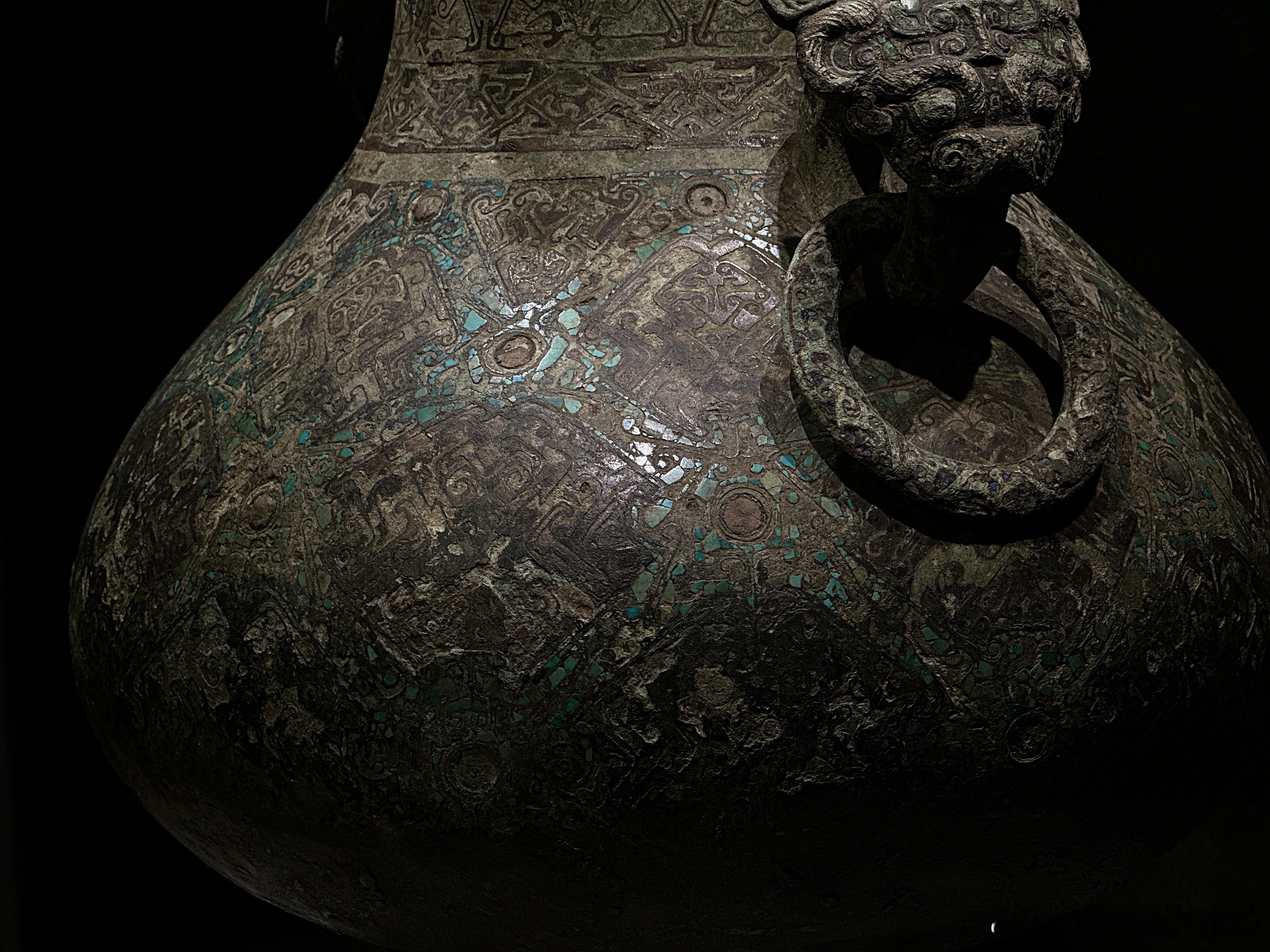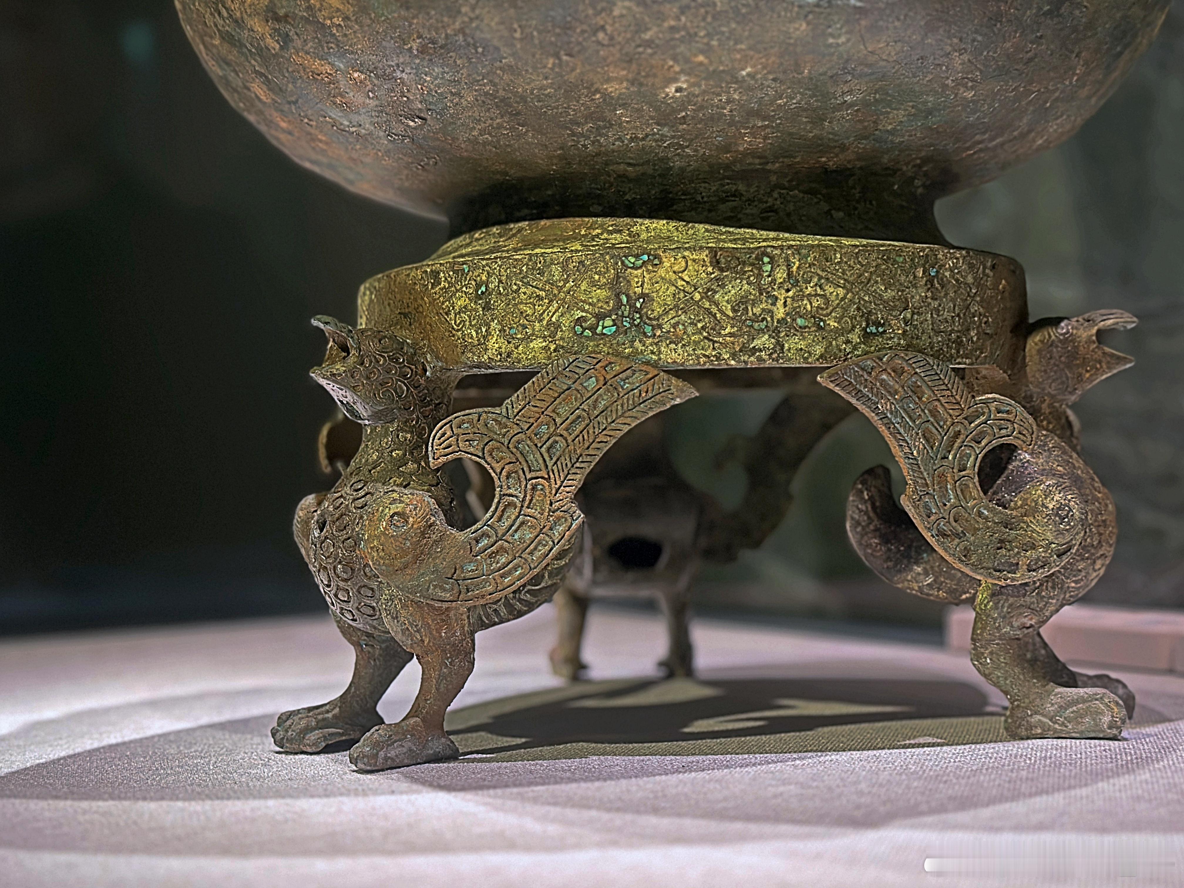 青铜错金银立鸟几何纹壶战国晚期南京博物院藏1965年江苏涟水三里墩西汉墓出土。通高63厘米、口径19厘米。壶体表面饰错金银,间嵌绿松石。此壶为战国晚期新出现的将镂刻、错金银、嵌玉镶珠、鎏金银等多种金属工艺融为一器,构思奇巧。盖、底均饰立鸟。盖中部隆起的壶边缘,蹲踞三对展翅欲飞的雏鸟,口微开,似鸣叫。壶盖中心有一圆孔,上加浮盖,浮盖上有五瓣梅花式钮,钮之顶端站一只双翅舒张、引颈高鸣的鸿雁。壶底以三鸟作器足,鸟形象生动,鸟爪扣地,鸟身后倾,双翅上扬。