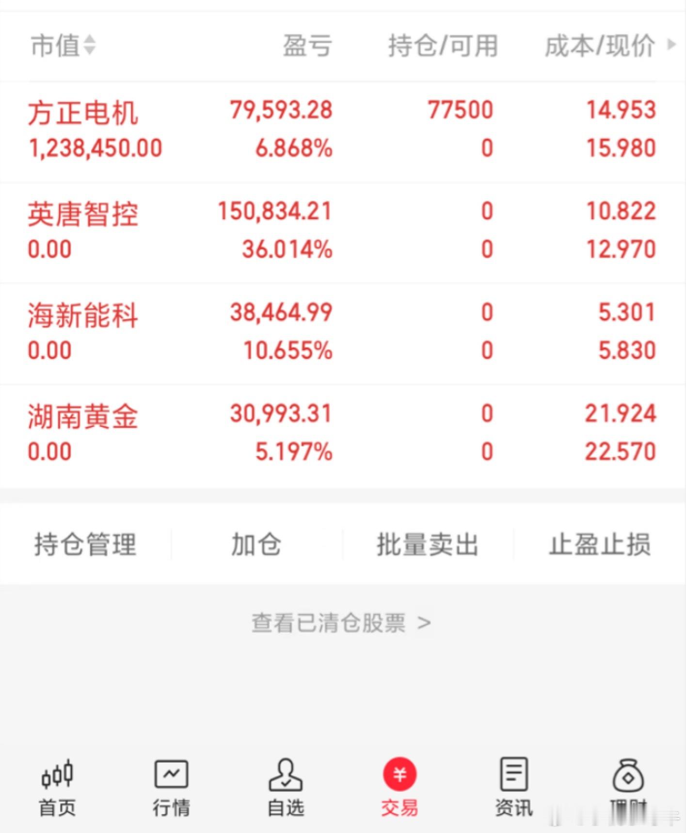 今天买入:方正电机今天卖出:英唐智控、海新能科、湖南黄金还是期待有肉吃… 喜欢短线来一起特别声明:这只是我个人的操作记录,不作为任何投资建议,更不是劝 你们有跟买是! 股市有风险,投资需谨慎!