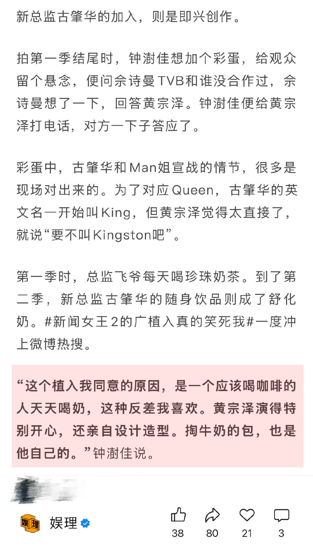 黄宗泽加盟《新闻女王2》源于即兴创作,只因佘诗曼在TVB和黄宗泽还未合作过。剧中黄宗泽的角色英文名一开始叫King,但他觉得太直接了,就说“要不叫Kingston吧”。谈及被热议的广告植入情节,总监制钟澍佳直言这种角色反差他很喜欢,“黄宗泽演得特别开心,还亲自设计造型。掏牛奶的包也是他自己的。”↓