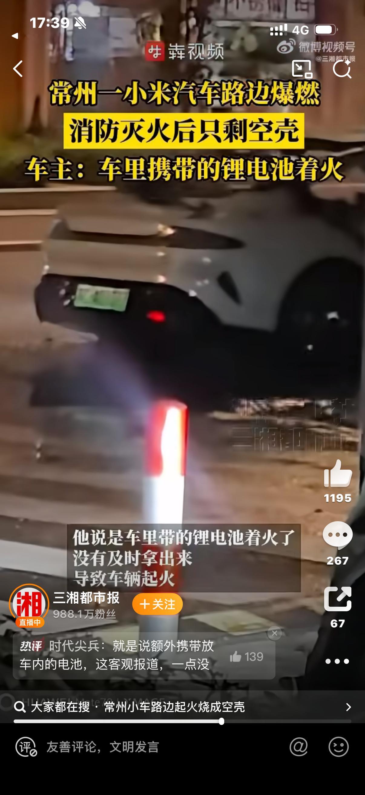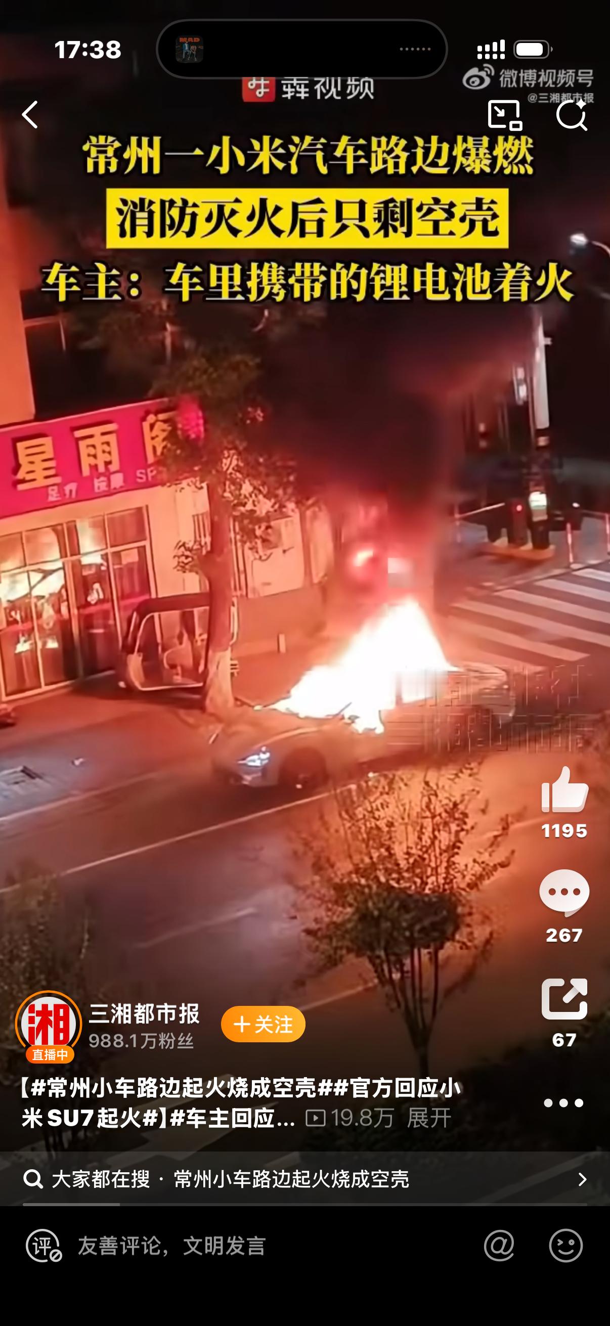 常州这个起火事件刚发酵,一堆人没搞清楚前因后果,就急着给车子扣 “质量问题” 的锅,这吃相多难看这不车主谭先生自己说的,放在车里的锂电池没及时拿出来导致起火,那其他东西作为导火线导致的起火会是车的问题?不信的直接看视频:着火时车灯亮着,说明车辆自带电池压根没受损,火苗也集中在乘员舱,跟车主说的 “后带锂电池起火” 完全对得上。有些人就盯着 “小米汽车” 四个字兴奋,不论真假,只要是小米汽车,就蹭一波热度,不然就活不下去。真要评说,先把事实摸透再说!