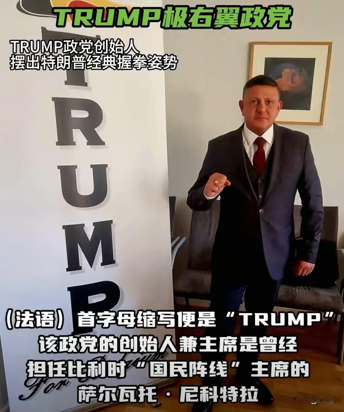 比利时成立了一个“特朗普”党。 据比利时媒体报道,近日比利时成立了一个极右翼政党,名字缩写为“TRUMP”,正好跟美国总统特朗普的名字一样。 这个政党的名称实为法语“Tous Réunis pour l'Union des Mouvements Populistes”,意思为 “团结民粹主义运动联盟”。是一个以社会问题为重点的右翼民粹主义政党,该政党该打算参加2029年的比利时选举以及欧洲议会选举。 不知道特朗普知道后,是高兴还是郁闷呢。