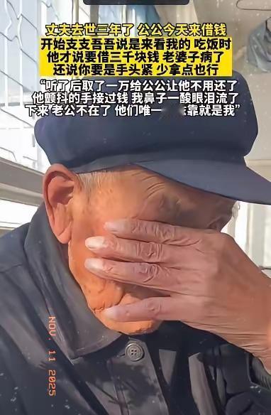 看完泪目!老公离世三年,公公突然上门扭捏借钱,儿媳一句话+洗万块暖哭全网 老公离世后的第三年一则发生在普通家庭的小事,让无数网友感受到了亲情的温度。 这天许久未上门的孩子爷爷突然到访,刚见面时支支吾吾只说“来看看你和孩子”。饭桌上老人终于忍不住扭捏开口,红着脸说明来意——孩子奶奶生病住院实在没办法才想来借点钱。话音刚落老人便迅速低下头,生怕给儿媳添麻烦紧接着又连忙补道:“我知道你一个人带孩子不容易,要是不方便我再想别的办法。” 看着公公局促不安手足无措的模样儿媳心里五味杂陈。她没多犹豫扭头就取来一万块钱递过去,还轻声安慰:“爸,钱您拿着给妈治病一会我带孩子去医院看望奶奶。”接过钱的那一刻老人的手忍不住颤抖,眼里满是感激与愧疚。而儿媳望着公公苍老的身影鼻子一酸眼泪掉了下来,认真说道:“爸,别见外,我永远是你们的女儿。” 这一幕被分享到网上后迅速戳中无数人的心。网友纷纷留言:“善良的儿媳太暖心了!老公不在了还把公婆当亲人”“公公的懂事让人心疼儿媳的重情重义更难得”“这才是家人该有的样子,不是血缘胜似血缘”。 都说“久病床前无孝子患难之中见真情”,老公离世后儿媳没有撇下年迈的公婆,反而用行动诠释了“孝道”与“亲情”。这份跨越血缘的牵挂与担当不仅温暖了老人的心,更让我们看到了人性中最珍贵的善良。你被这份双向奔赴的亲情打动了吗?欢迎在评论区分享你的感受!