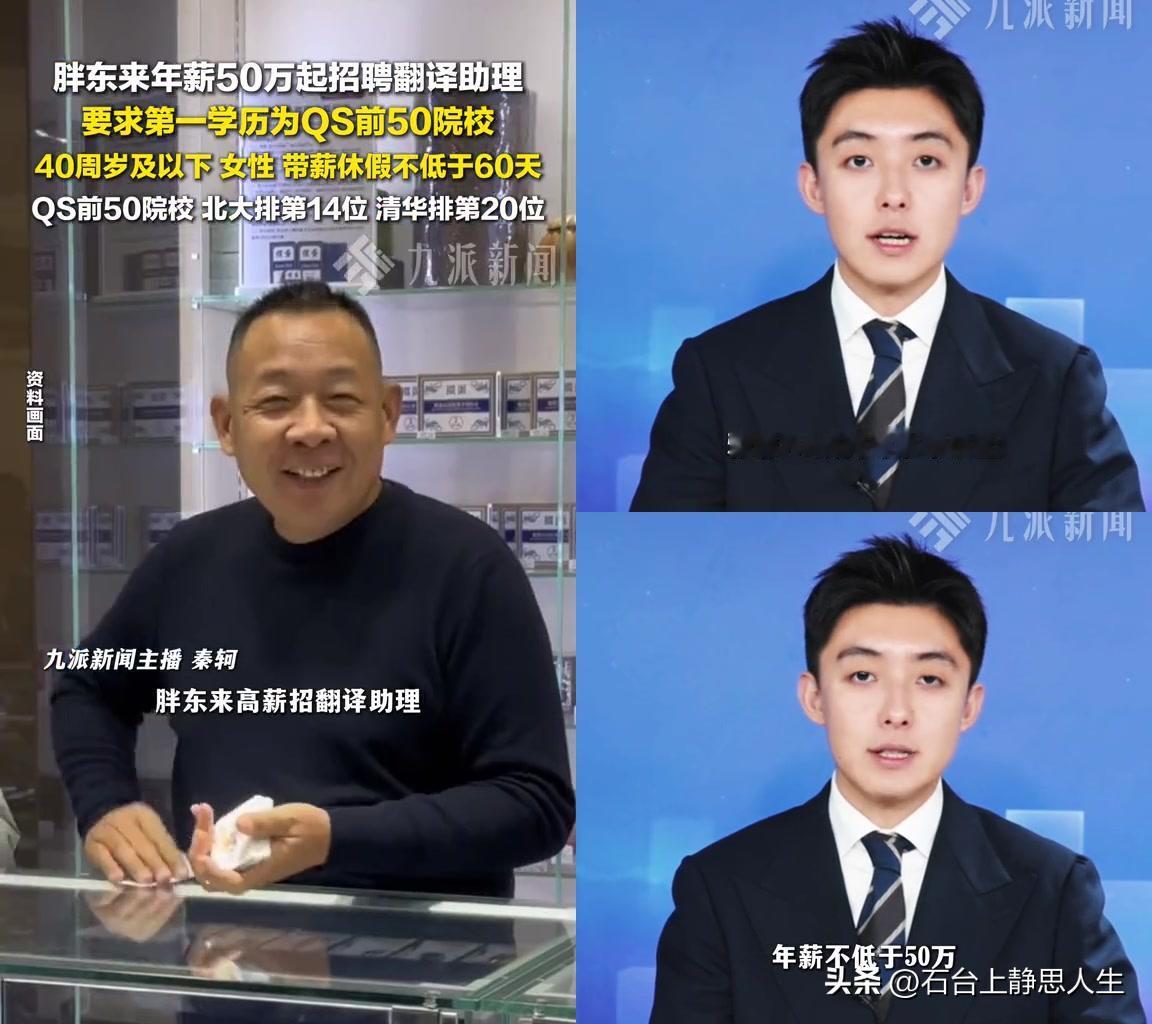 胖东来这招聘,看完我直接懵了! 招个中英翻译助理,要求第一学历是QS前50的女性,40岁以下,年薪50万起,带薪休假不低于60天,清北才排QS14、20名,国内没几个学校够格! 有人说这待遇比央企香十倍,俩月带薪假,躺平都能赚;也有人说QS前50去胖东来,不怕同学笑话? 但我觉得,胖东来才是真懂行,要对接国际专家,就得用顶级翻译,不然传错话都麻烦;再说50万+60天假,换我我也冲!就是性别卡这么死,多少有点没必要。 大家怎么看?