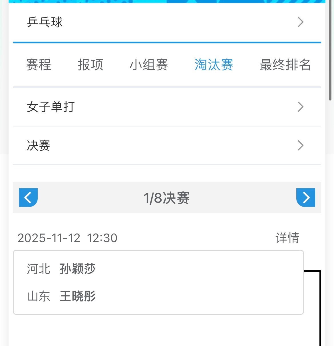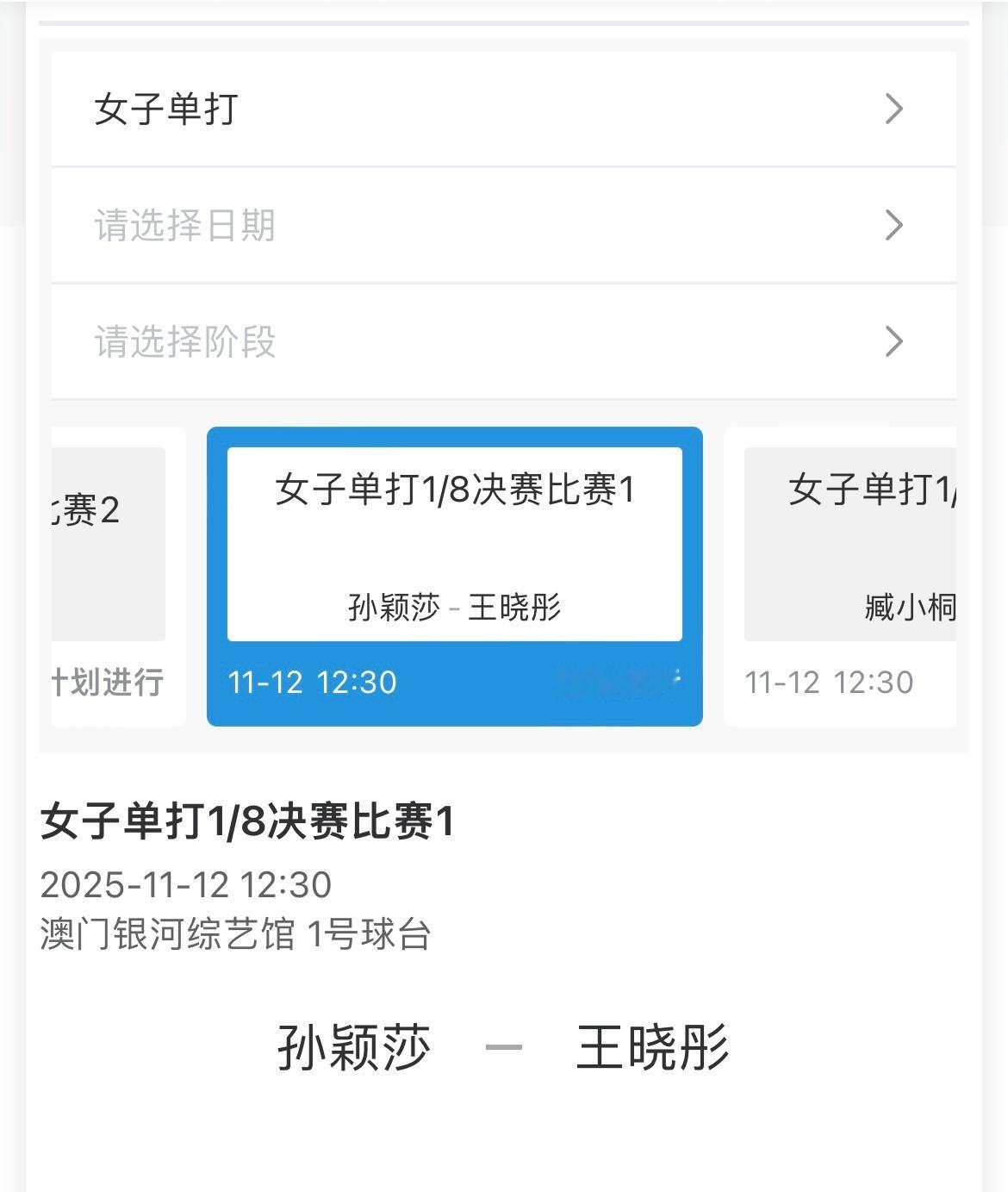 20251111|第十五届全运会女子单打赛程女子单打1/8决赛11月12日 12:30 T1 孙颖莎VS 王晓彤孙颖莎比赛加油加油加油加油