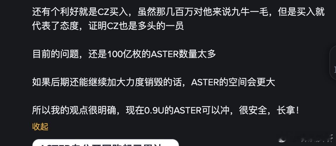 你跟随喵叔买到0.9U的ASTER了么?本来ASTER在没有回购机制之前,喵叔是绝对不看好的因为它总量太大了,后期解锁抛压过大后来CZ买入➕回购机制完善后,我在11月3日明确看好ASTER未来的发展当时ASTER的价格在0.9U,如果你跟上喵叔的脚步,现在收益在20多个点了后期进入熊市(我认为就算熊市也不会很深),ASTER这种包含回购机制的代币是不错的定投标的物