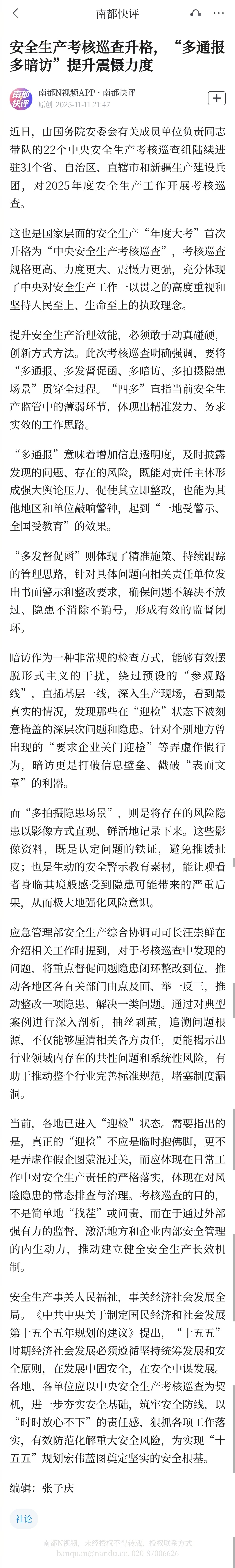 【南都快评:安全生产考核巡查升格,“多通报多暗访”提升震慑力度】近日,由国务院安委会有关成员单位负责同志带队的22个中央安全生产考核巡查组陆续进驻31个省、自治区、直辖市和新疆生产建设兵团,对2025年度安全生产工作开展考核巡查。这也是国家层面的安全生产“年度大考”首次升格为“中央安全生产考核巡查”,考核巡查规格更高、力度更大、震慑力更强,充分体现了中央对安全生产工作一以贯之的高度重视和坚持人民至上、生命至上的执政理念。提升安全生产治理效能,必须敢于动真碰硬,创新方式方法。此次考核巡查明确强调,要将“多通报、多发督促函、多暗访、多拍摄隐患场景”贯穿全过程。“四多”直指当前安全生产监管中的薄弱环节,体现出精准发力、务求实效的工作思路。