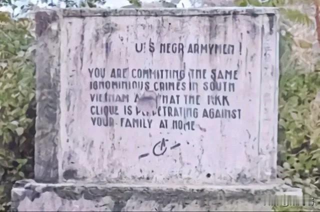 1970年,一名非裔美国黑人士兵在越南南部的丛林战场阅读越共(越南南方民族解放阵线)留下的宣传信息。宣传信息被刻在一个类似墓碑的混凝土块上 :“美国黑人士兵,你们在南越犯下了三K党对你们国内家人犯下的同样可耻的罪行。”