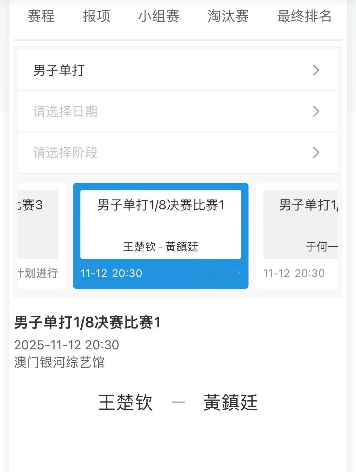 20251111|第十五届全运会男子单打赛程男子单打1/8决赛11月12日 20:30 桌号待更新王楚钦VS黄镇廷王楚钦比赛加油加油加油加油