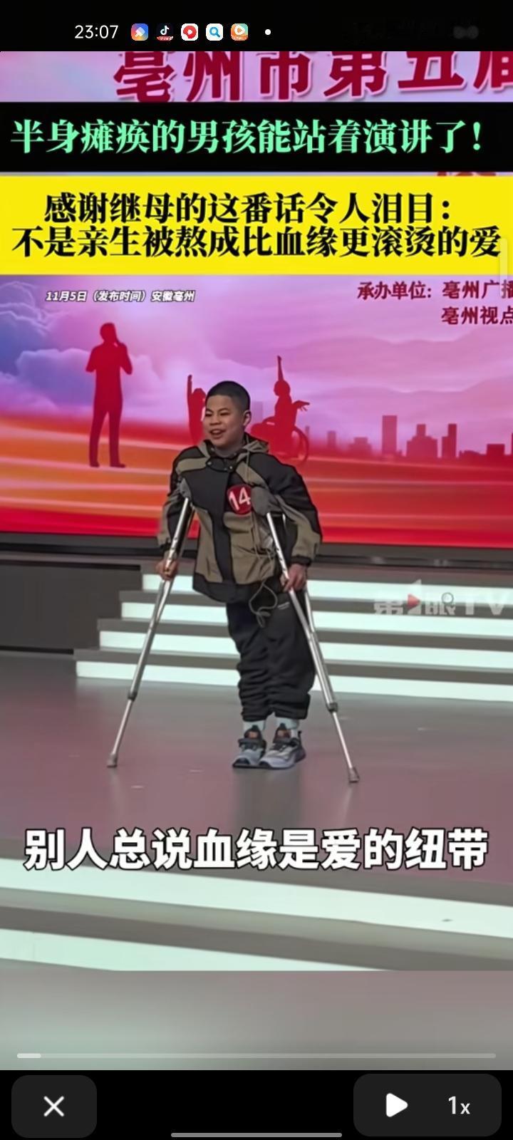 11月5日,安徽亳州。半身瘫痪男孩朱晨菡杵着拐杖在台上演讲:超人妈妈把“不是亲生”这四个字熬成比血缘更滚烫、更分不开的牵挂。演讲完毕后,主持人称他有一个那么好的妈妈觉得,听完这段故事后,妈妈真的很美。前年六月,他参加了东方卫视妈妈咪呀节目,他的话语让在场的人感动落泪 据了解,朱晨菡年幼时遭遇医疗事故半身瘫痪,继母于女士一边照顾他,一边给他赚钱做手术。目前手术很成功,孩子平安出院了。