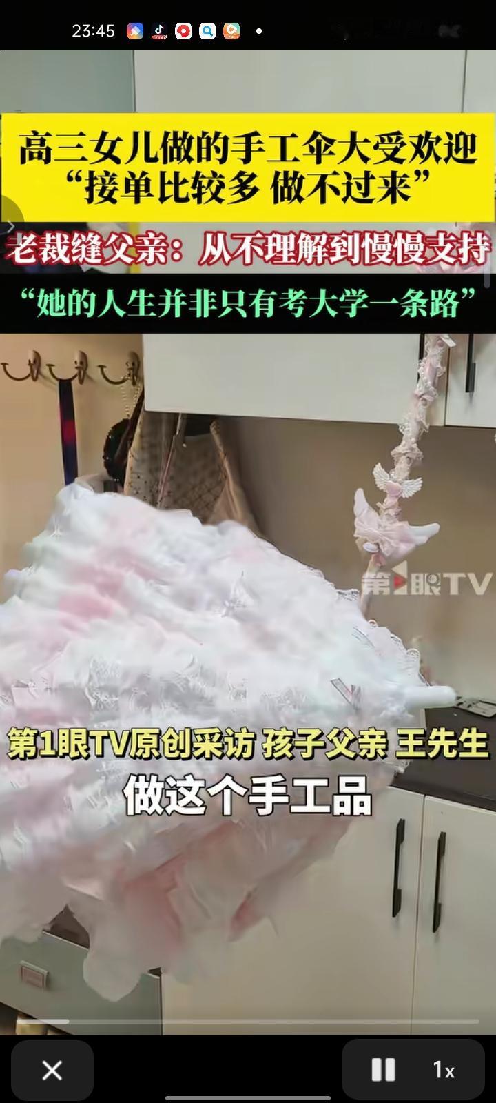 11月10日,宁夏银川。读高三的女儿迷恋制作洛丽塔手工伞,身为老裁缝的父亲从不理解到慢慢支持。孩子爸爸王先生介绍,女儿进入高中后,比较喜欢动漫、二次元,喜欢制作手工伞。这两年孩子做的比较好,在利用节假日、星期天的时候做一做,目前已有一万多粉丝了,从不理解到家长现在也挺支持她的。