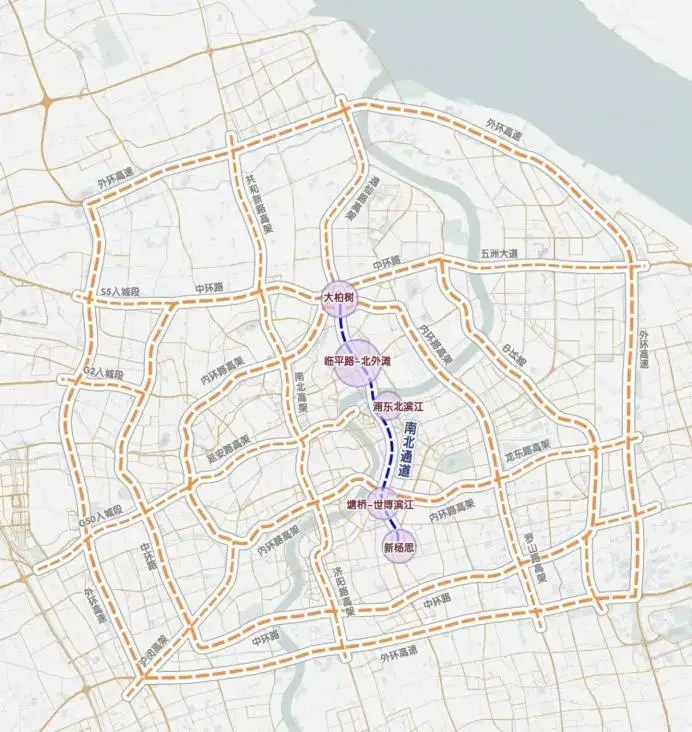 规划中的南北通道工程,拟采用地下道路为主的建设型式,北起大柏树立交,沿曲阳路-曲阳南路-临平路-高阳路-浦东南路-浦三路-杨高南路走行,南至成山路,接入杨高南路,并规划预留进一步向南延伸条件。