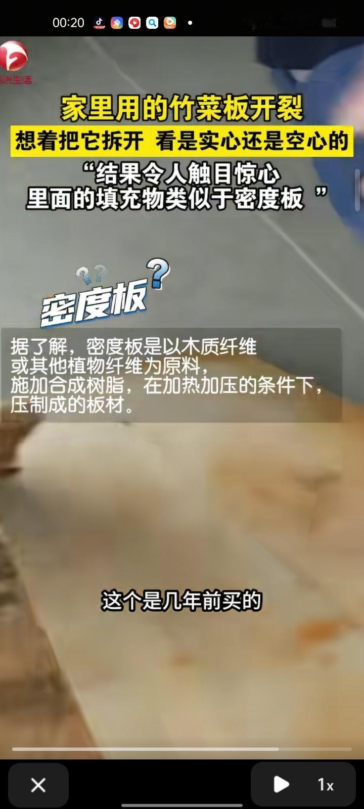 11月9日,河南郑州。女子晒视频称,家里的菜板有些开裂,又买了实心菜板,顺便把竹菜板拆开是不是空心的,结果令人触目惊心,里面的填充物类似密度板。这菜板是几年前买的,花了两三十左右