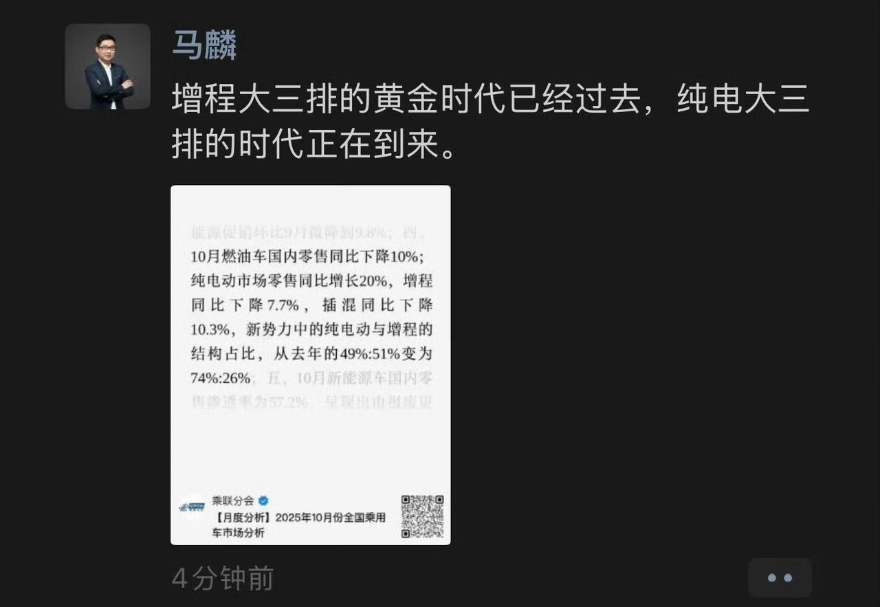 蔚来马麟:增程大三排的黄金时代已经过去,纯电大三排的时代正在到来! 增程车的市场份额相比较确实是在下滑,可能是纯电车的基础设施特别的完善吧,在绝大多数地方充电已经没有太多的烦恼了,小编的老家在大山深处,镇上已经装上了快充桩。 像有一点应急的时候,也可以使用车辆的随车充进行补电,比如在老家住一晚上也能充进去不少电,如果就在周围开一开,完全可以在自己家充电,虽然每天补的电比较少,但足够日常使用了。 各位是怎么看的?欢迎评论区留言。