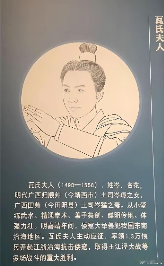 瓦氏夫人(1496或1497-1555或1556),原名芩花,岑猛之妻。壮族,归顺县(今靖西县)人,明代武艺家、抗倭女英雄。1528年击退交趾(今越南)入侵。1554年亲率6800余人的“俍兵”(广西土司军队)远赴江浙抗倭,屡建奇功,受封“二品夫人”。抗倭期间其运用并传授了著名的“鸳鸯阵” 前身——“瓦氏双刀术”,首战即解了金山卫之围。1555年其指挥的王江泾大捷是抗倭史上第一场大规模的胜利。戚继光抗倭的时间主要集中在1555年至1566年之间,比瓦氏夫人晚一年。