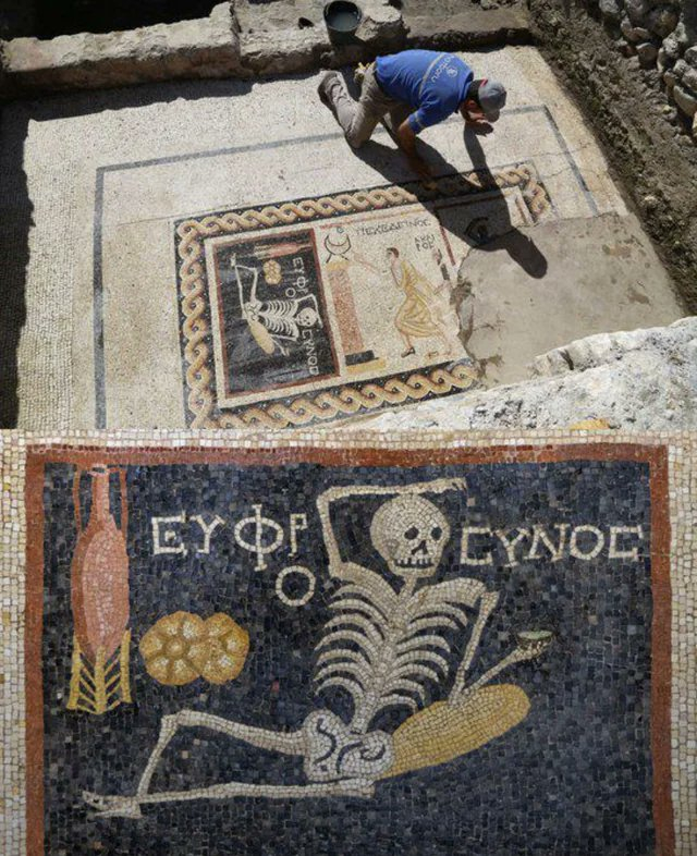 土耳其发现的一幅有2400年历史的骷髅马赛克,上面写着:“保持乐观,享受生活”。