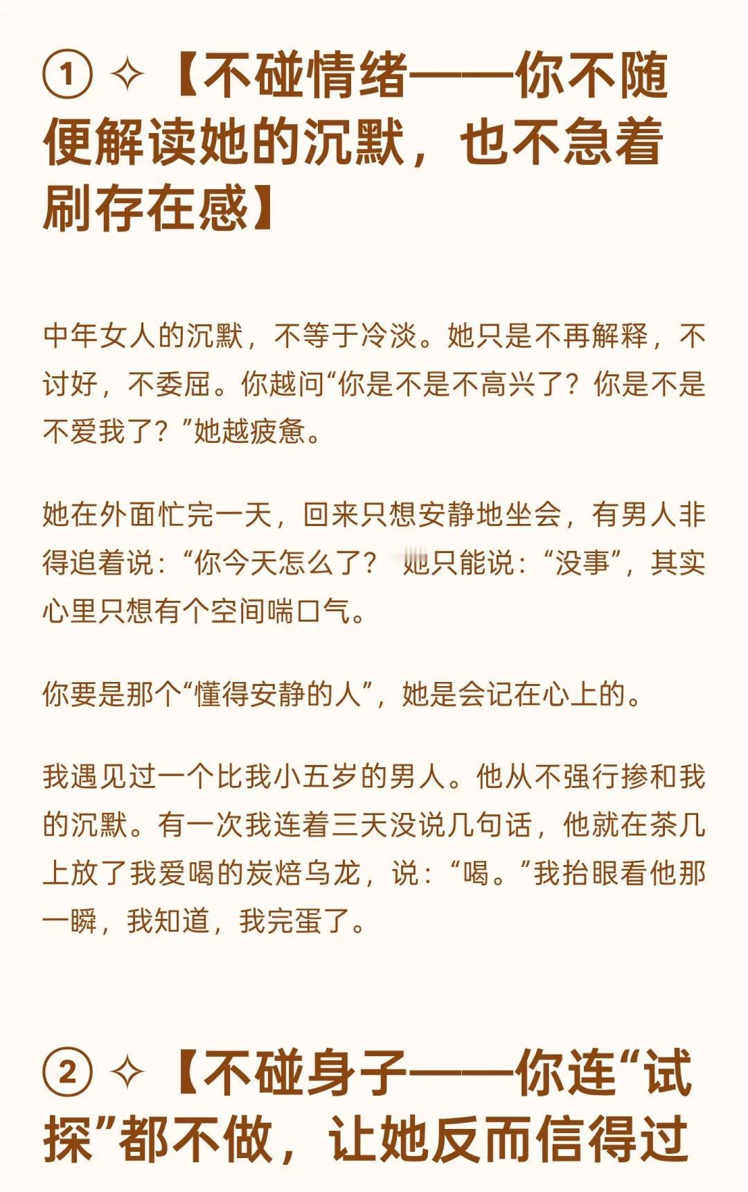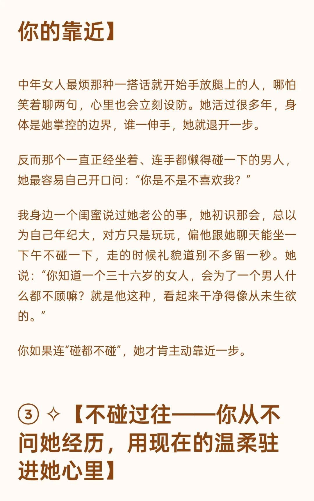 和中年女性相处,别只盯着表面,要懂得她们的心理变化。 她们比年轻人更敏感情绪,更重视独处时间和个人空间。 社交中,不要轻易触碰情绪操控,毕竟研究显示她们对虚伪和操控非常敏感,回应要稳重有分寸。 身体距离也很讲究,过多身体接触反而会让她们有防备心理,保持适当距离更能赢得信任。 对过去的追问更要慎重,她们记忆敏锐,敏感话题应巧妙夹在中性问题中。 在数字时代,尊重她们的边界变得尤为重要。 避免过度频繁打扰,不主动发信息要更有耐心,朋友圈的互动要自然 creeping。 喜欢平行空间的共处方式,静静做自己的事,彼此反而更自在。 建立信任要讲究技巧,比如通过表现危机应对力和微表情控制来传递安全感。 总之,要懂得尊重她们的节奏,让交流变得温暖自然,而不是强求对方打开壳。 真正的关爱,就是在细节中体现出的耐心和尊重。