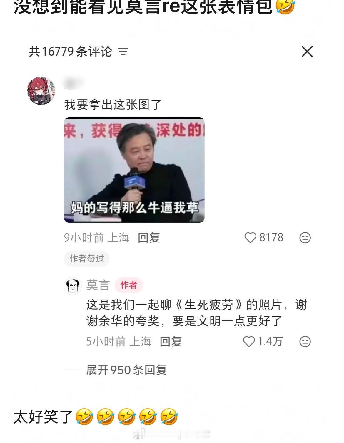 莫言:谢谢余华的夸奖,要是文明一点更好了。哈哈哈哈哈哈哈哈甚至是本人回复
