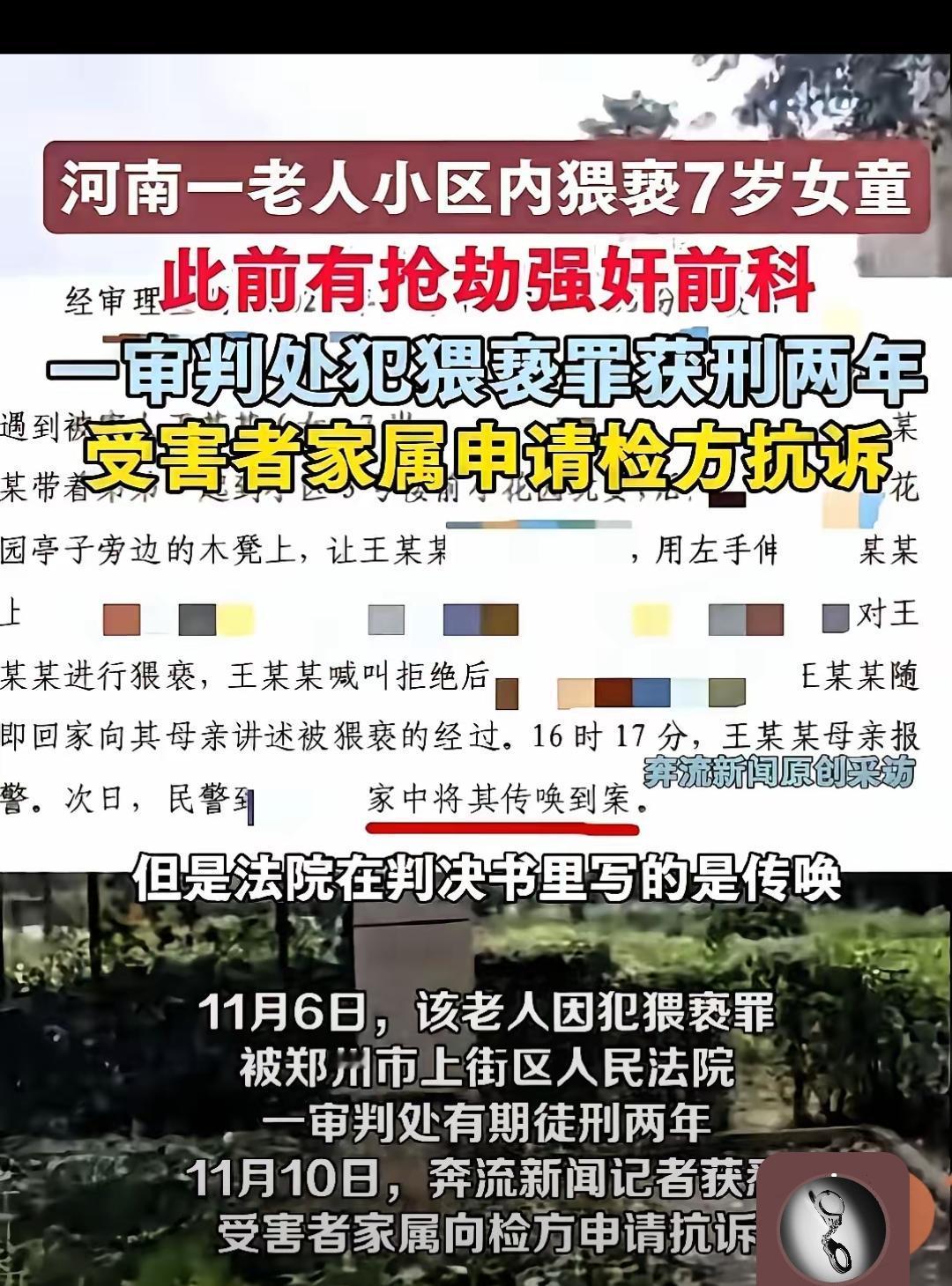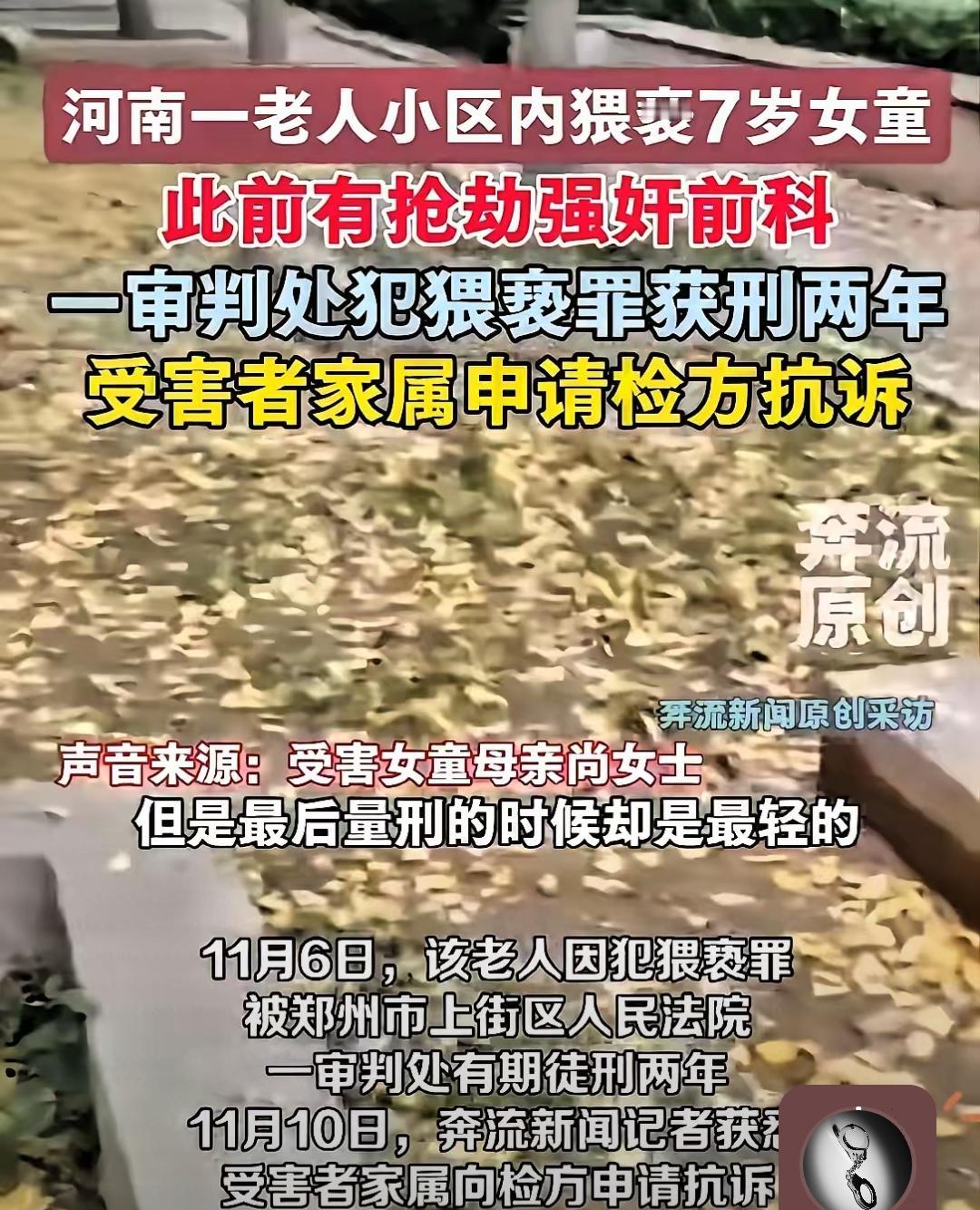 7岁女童在小区当众遭猥亵,施暴者是有抢劫、强奸前科的惯犯,最终只判两年,这结果真的让人意难平! 法律不该只盯着条文,更要守住保护孩子的底线。老人明知对方是幼女,还在公共场所作案,主观恶性和人身危险性远胜初犯,就算过了累犯期限,这份“屡教不改”的风险也该成为量刑关键。 最让人寒心的是35万索赔被驳回,刑事附带民事只认物质损失,可孩子的心理创伤是一辈子的,这份无形的伤害难道就不算损失? 对侵害未成年人的犯罪,轻罚从来换不来震慑,只有让施暴者付出对等代价,才能给孩子和家长一份安全感。 家属选择抗诉上诉太让人支持了!你觉得这样的判决合理吗?该如何更好保护孩子免受侵害?来评论区聊聊~