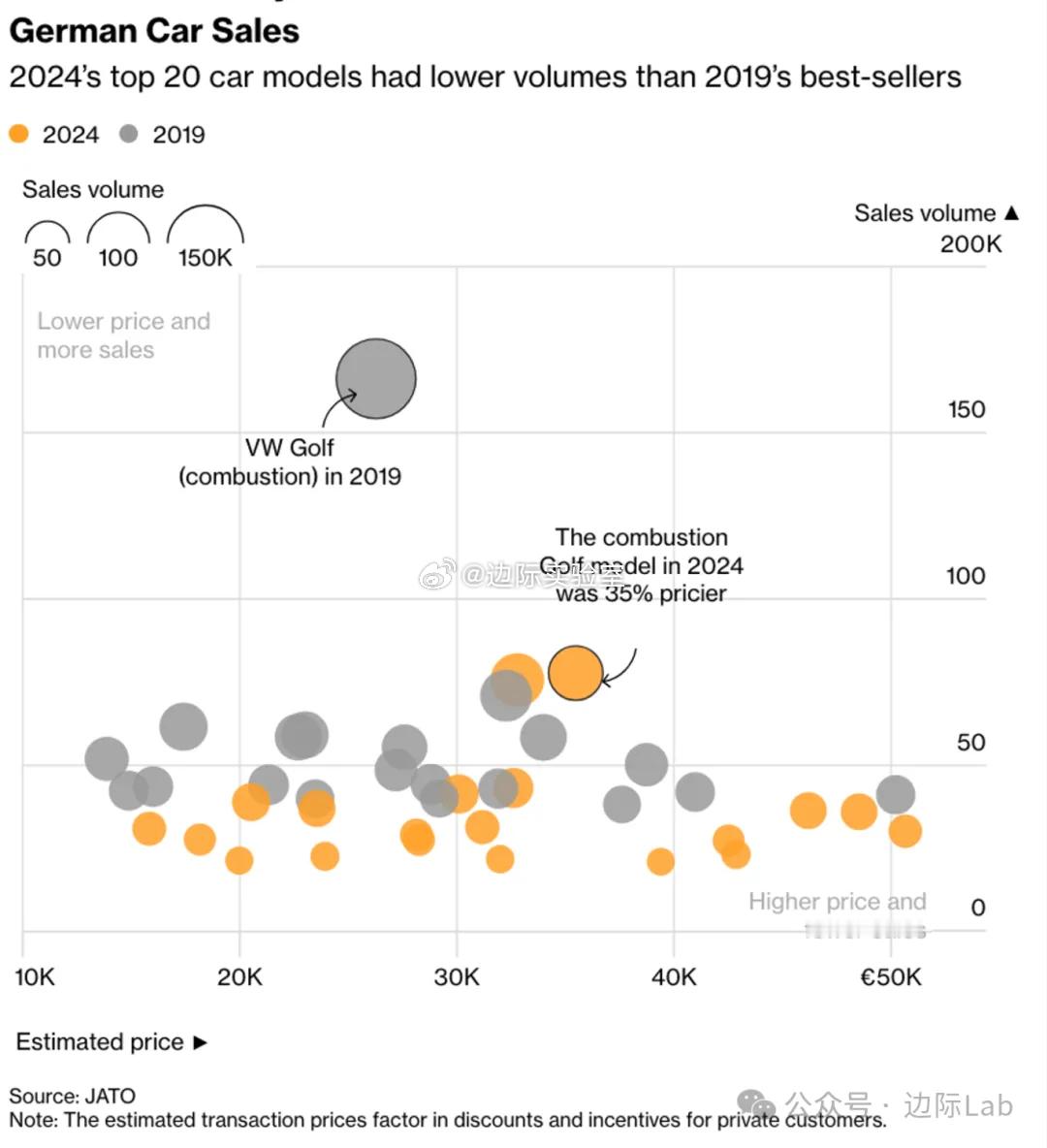 德国汽车制造商正从经济型细分市场战略性后撤,这一策略直接推高了新车平均售价,并导致整体销量持续低于疫情前水平。 JATO Dynamics的数据显示,2024年德国销量排名前20的车型,其销量均低于2019年的畅销车型,以大众高尔夫燃油版为例,其2024年的售价较2019年高出35%,而销量则大幅萎缩。欧盟电动车型因定价过高,加之政府补贴退坡,未能有效吸引大众市场买家,无法填补平价燃油车退出后留下的市场空白。来源:Bloomberg