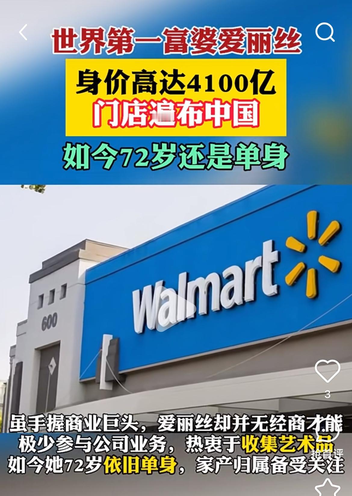 75岁女首富爱丽丝·沃尔顿, 给全天下“不上班只烧钱”的人上了一课, 那就是钱不用来拼事业,只要花在艺术慈善上,你就是人生最大的赢家! 她75岁,钱是从沃尔玛创始人爸爸那继承的,1124亿美元身家,每天睁眼就有千万进账。不上班不结婚没小孩,现在住得州牧场,养马赏画开慈善派对,日子过得比很多人梦里还美。 年轻时创业失败、婚姻不顺,现在倒想通了,把钱投到艺术、医疗、教育这些地方。建艺术中心、搞医疗项目,别人说她败家,她倒用这些钱给社区造了不少实在的东西。 你说她这钱烧得值不值?我看比堆在银行里有意义多了!