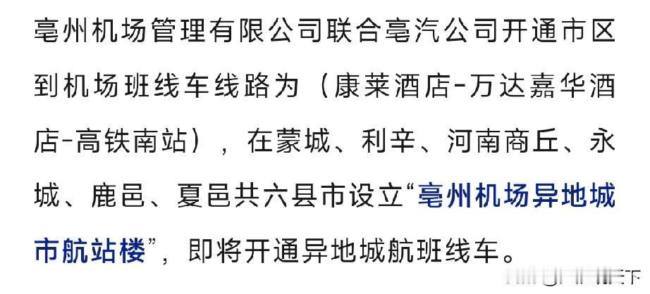 亳州机场今天通航,服务安徽,河南2省8市区县的老百姓出行 亳州晚报等媒体消息,11月12号,安徽省亳州机场正式通航,首航航线是直达深圳。 这是安徽省民航发展史上的大事,同时也为长三角机场群增加新生力量。 亳州机场除了开通市区到机场专线班车,还在周边的蒙城,利辛,河南商丘,永城,鹿邑,夏邑县设立异地机场候机楼,开通异地航班班车。 亳州机场服务亳州市1区3县,河南省4市县,超千万老百姓的日常出行。安徽民航机场 亳州游玩好去处 安徽机场排行榜 亳州涡阳机场 亳州机场试飞 亳州空运