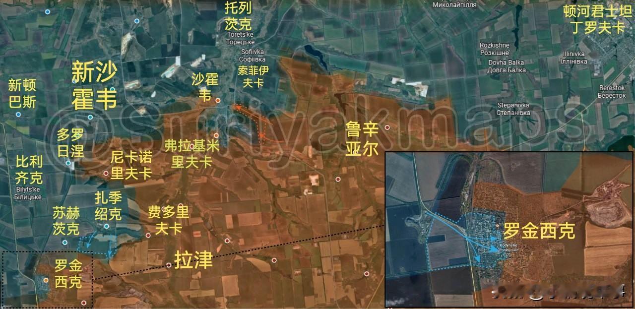 11月10日俄乌最新战报: 1.恰索夫亚尔前线: 自11月初以来,经过一个月的阵地战,俄军已攻入了迈斯克村(图一)。 2.沙霍韦和罗金西克(红军村方向)前线: ①过去五天里,俄军从东面对沙霍韦村发动了新的进攻,再次进入该村(图二)。 ②乌军重新夺回了扎季绍克村的南部地区,并继续尝试抵达费多里夫卡村(图二)。 ③过去一周里,俄军和乌军部队继续在罗金西克市发生冲突,乌军在该市的中心和南部取得了新进展。目前,俄乌双方均控制了该市一半的地区。 3.第聂伯罗彼得罗夫斯克州前线: ①过去三天里,俄军控制了奥列斯托皮利村南部的阵地,并继续进攻以夺取邻近城镇大米哈伊利夫卡。 ②过去几小时里,俄军完全控制了索洛德克村和诺韦村,并占领了一些阵地,直至亚布卢科韦村的郊区。 俄罗斯军事战报 顿涅茨克争夺战 莫斯科战报