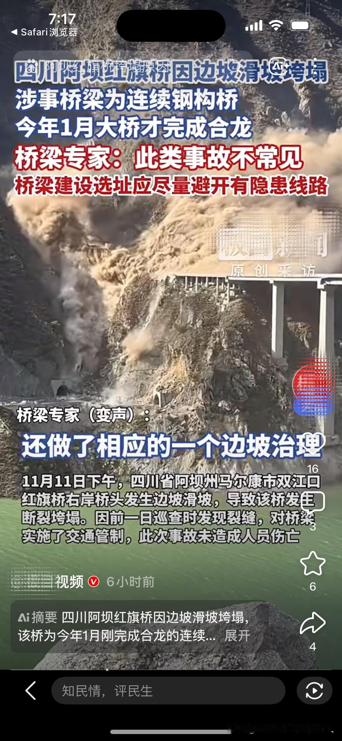 四川阿坝州红旗大桥垮塌事件! 现在最慌的估计不是施工方,也不是监理工程师,而是负责勘探大桥周围山体地质的,从现场视频看来,山体先冒出了滚滚的浓烟,然后大桥才塌的。 所以应该是山体滑坡把大桥冲垮的,桥的设计和质量大概率没问题,因为除了被冲击的桥墩,河中的桥墩和桥体还在。 幸亏巡查人员的细心,发现路面裂缝后立刻封路管制,5个分流点同步疏导,把风险掐灭在萌芽里。比起争论地质勘探是否到位,更该认可这种“防患于未然”的责任心,这才是公共安全最靠谱的防线。给巡视人员点赞,预防了可能发生的悲剧!