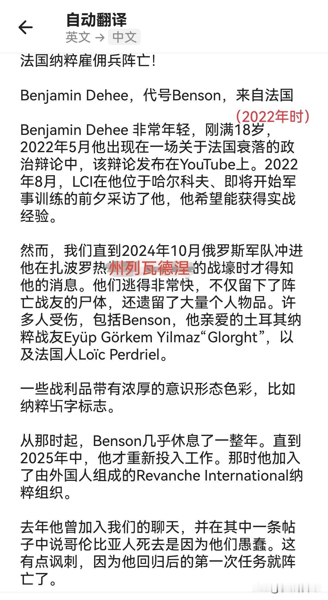 🇫🇷🇷🇺🇺🇦近期,一名加入乌军的法国雇佣兵本杰明·德伊(代号“本森”,Benson)在库皮扬斯克方向被俄军消灭。 值得注意的是,2022年来到乌克兰时,本杰明·德伊年才18岁,直到3年后在战场上阵亡的时候,加起来也才21岁。 库皮扬斯克战斗 库皮扬斯克战事 库皮扬斯克之战