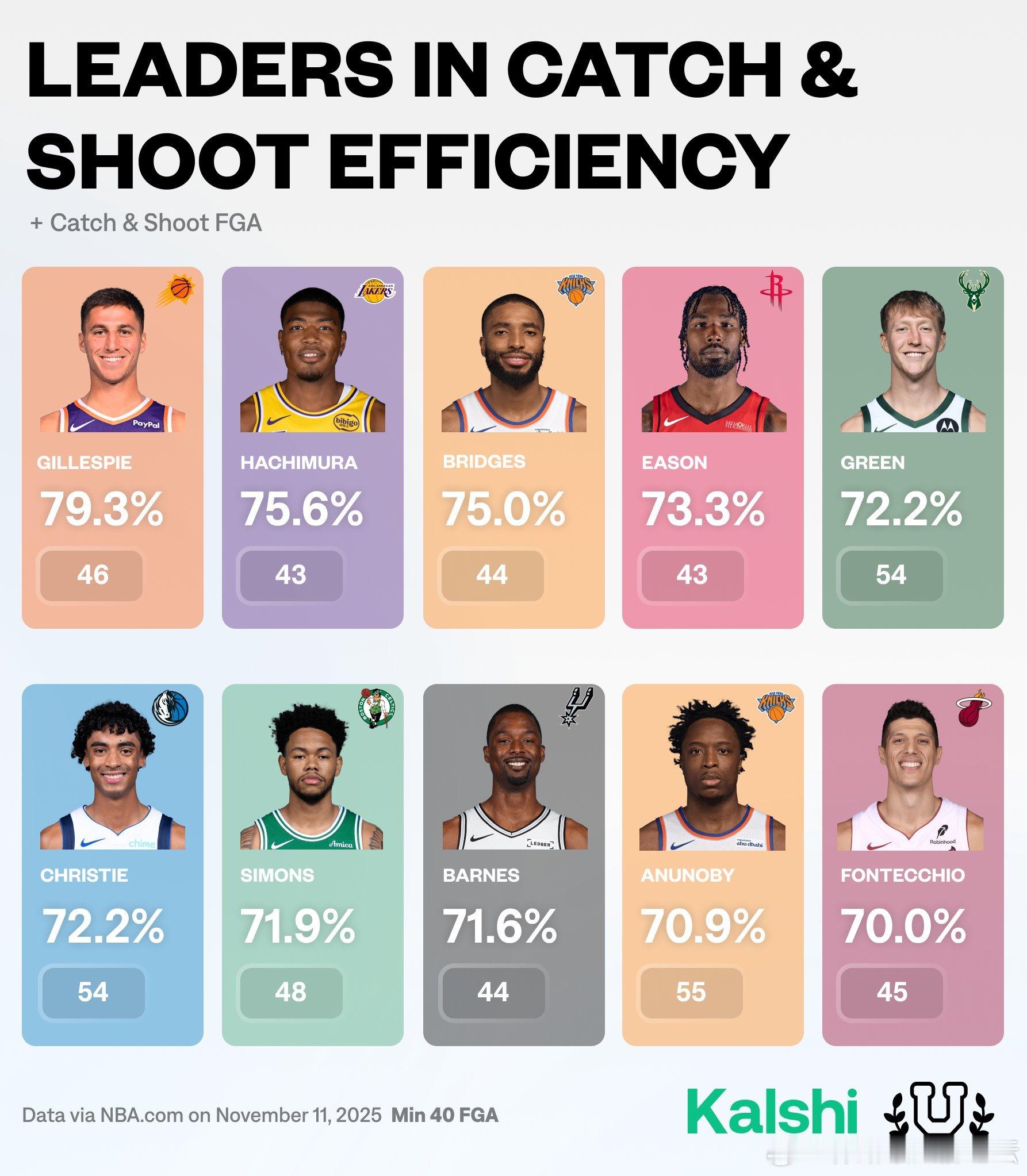 接球投篮有效命中率榜单:伊森73.3%联盟第四