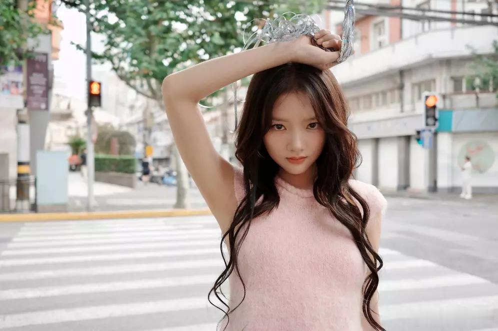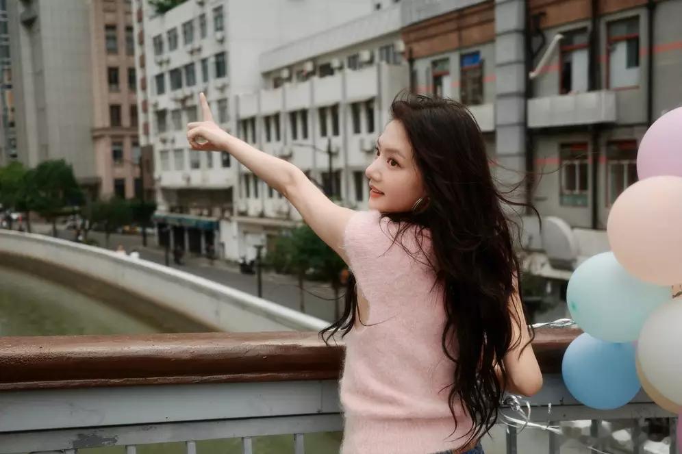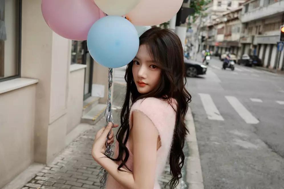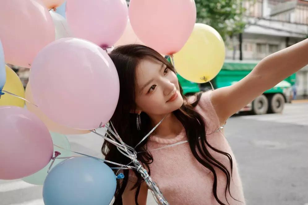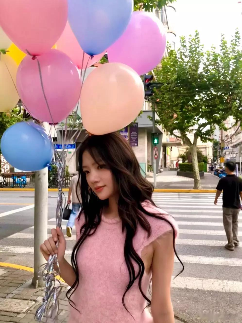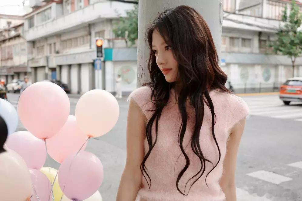 任敏身穿粉色无袖上衣,拿着超多气球拍照,秒变娇嫩少女,甜美又可爱!