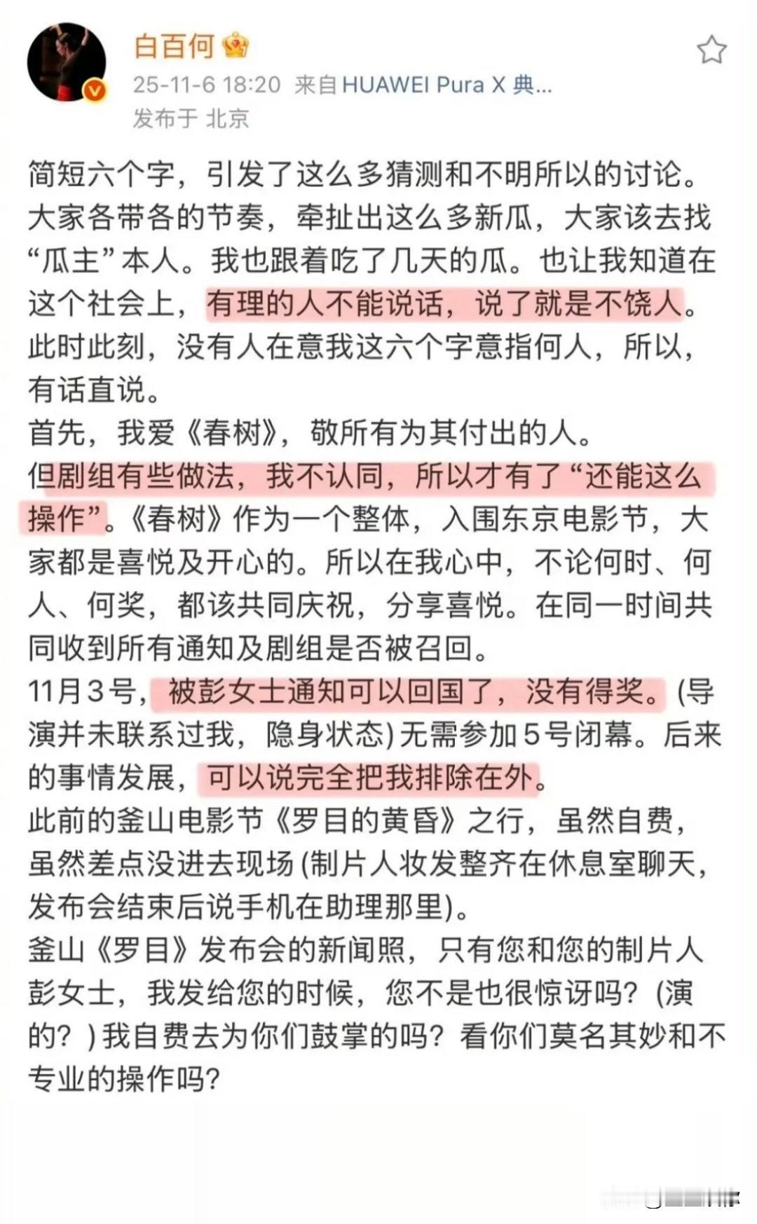 本来大制作就不会用白百何了,她现在唯一能用的就是演技了,可以找张律这种国内知名度不高的文艺片导演合作。结果这么一闹,以后文艺片也不敢找她了。 我真的觉得她好可惜,之前那个事根本不是她的问题,就那么从巅峰掉了下来,从这一点上我是真的很支持她东山再起。演文艺片冲奖是多好的路线啊,连着两部都在国际上得奖了,虽然不是个人奖但对职业履历也是有大益的,明明挺好的发展趋势,因为这么点事就闹成这样。