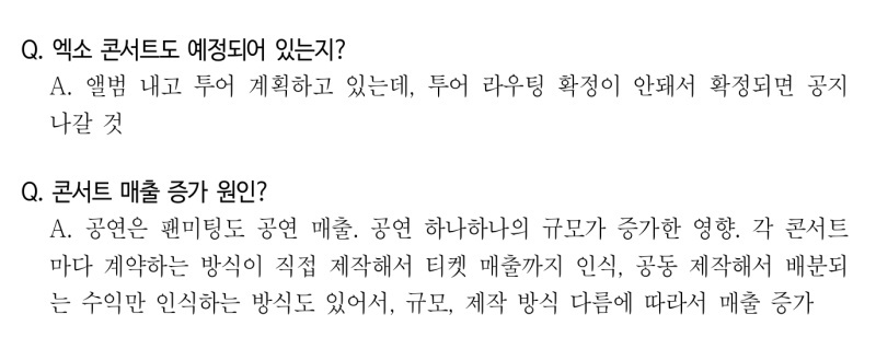 在SM CEO问答环节中,有人问到了EXO演唱会相关问题。SM方面表示,EXO计划在发行正规专辑后举办巡回演唱会,但具体巡演路线(演出城市路线安排)尚未最终确定,一旦确定就会公布!