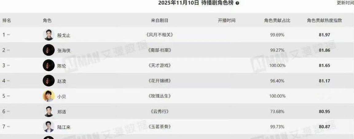 邓为《风月不相关》剧集榜待播剧热度第一,云秀行第四,殷戈止待播剧角色榜第一,双