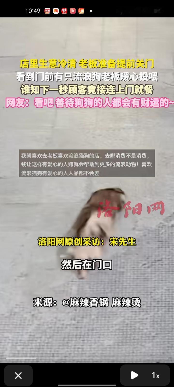 11月10日,西安市周至县。店里生意惨淡,老板准备提前关门时,看到门前有仅剩三条腿的流浪狗,就拿点吃的给它喂。下一秒,三位顾客接连上门就餐,硬是把惨淡的生意网上提了提,网友夸赞老板:善待狗狗的人都会有财运的。