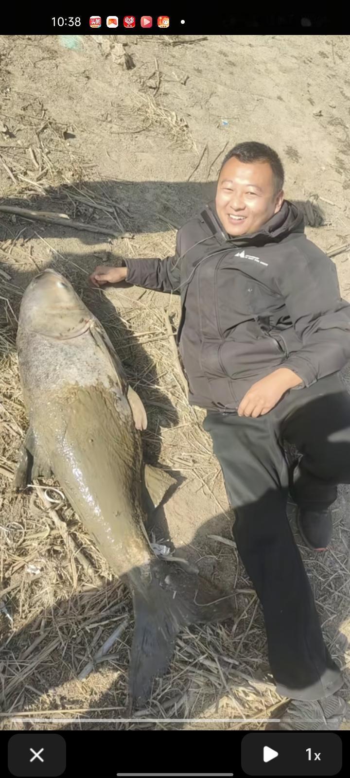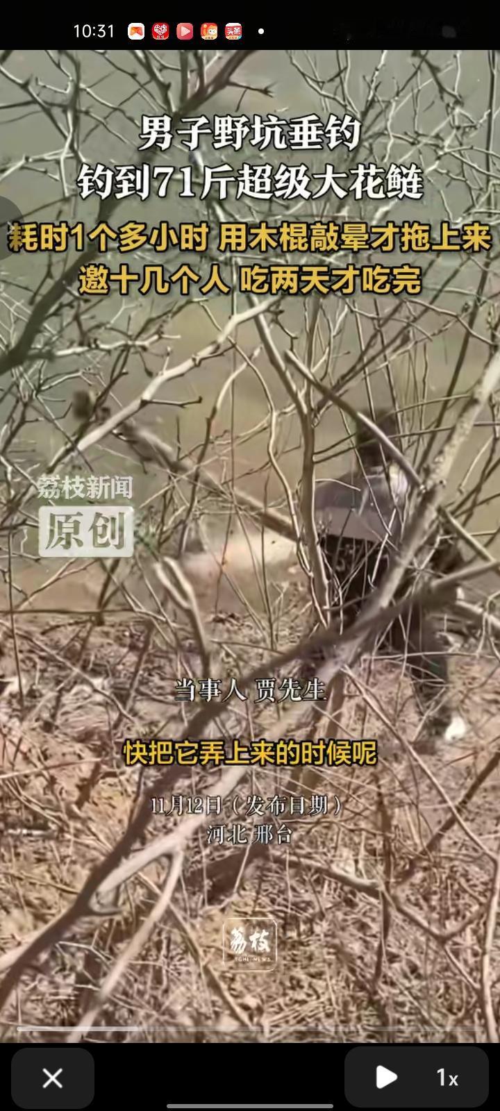 11月10日,河北邢台。71斤重的大花鲢难钓上岸,钓鱼佬先用棍子敲它几下,敲晕后连锚带拽就拽上来了。最后,他邀请几十个人来吃鱼,两天就吃完了。