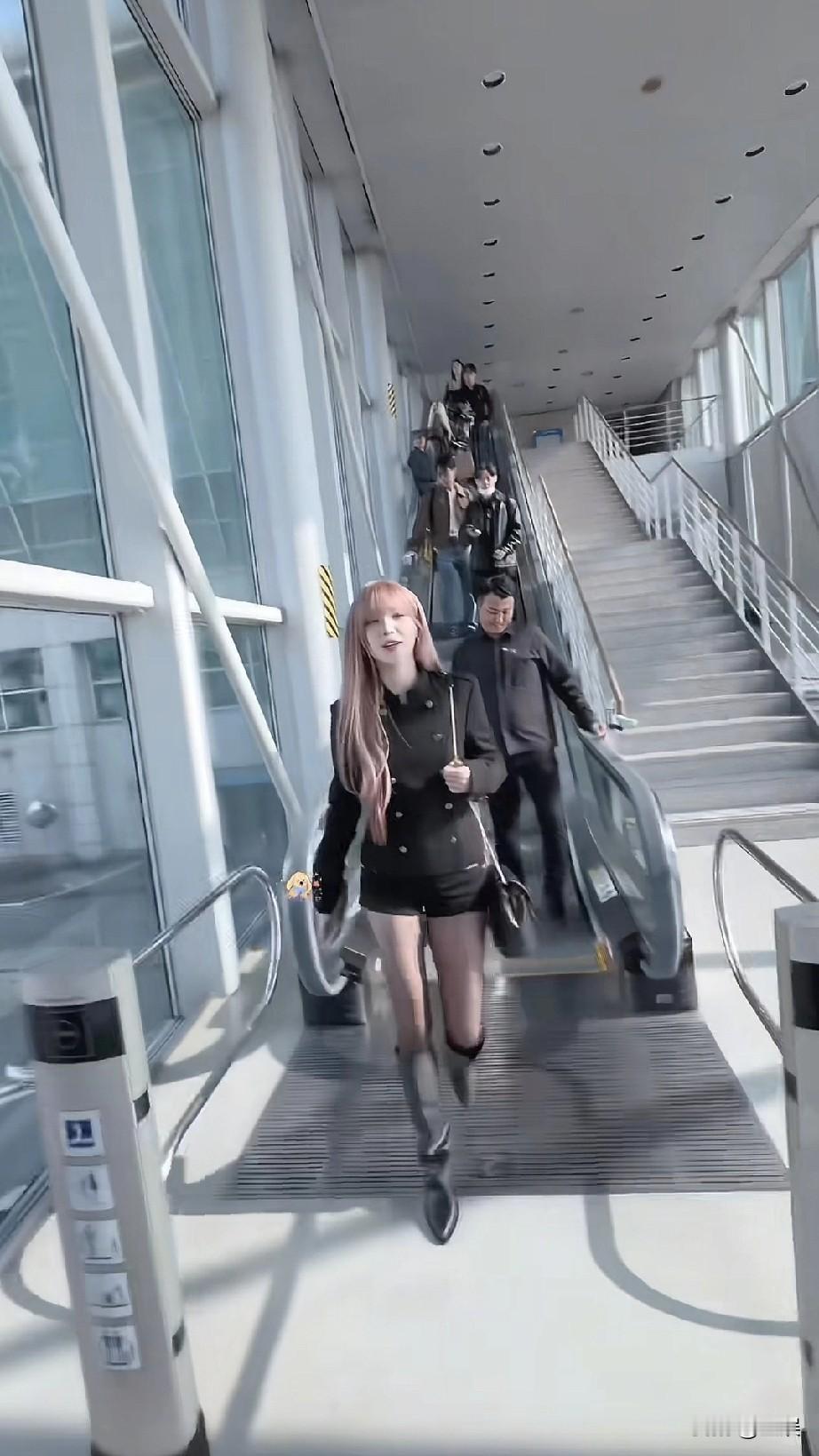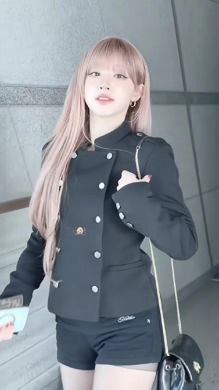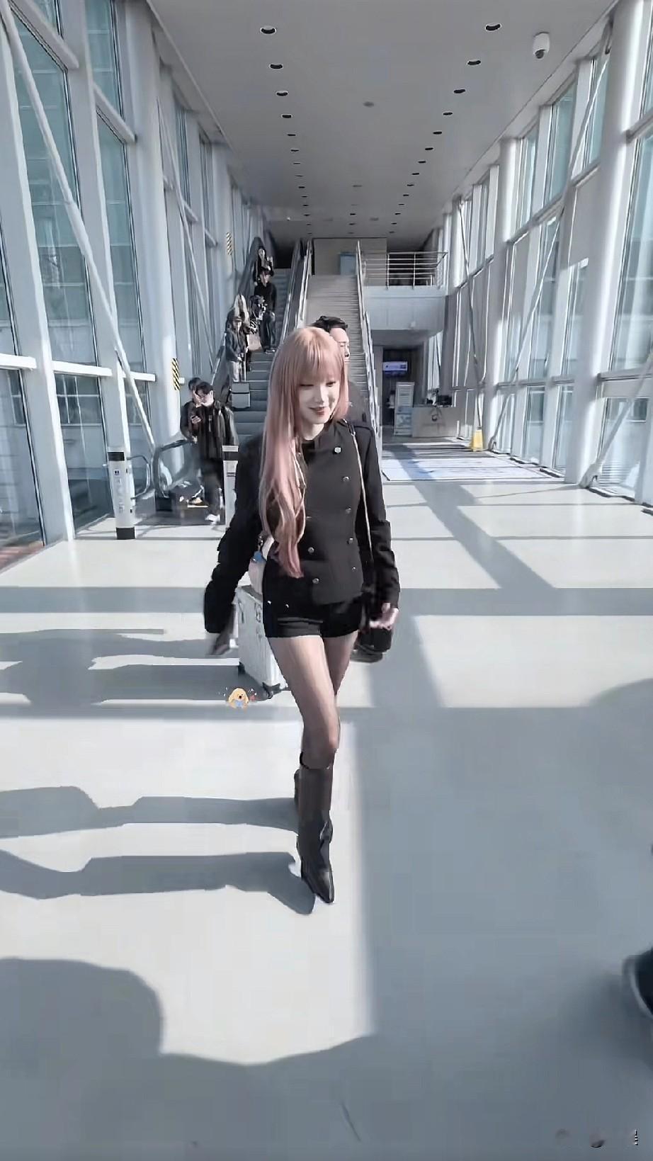 宋雨琦机场粉色长发,黑色短款外套配短裤