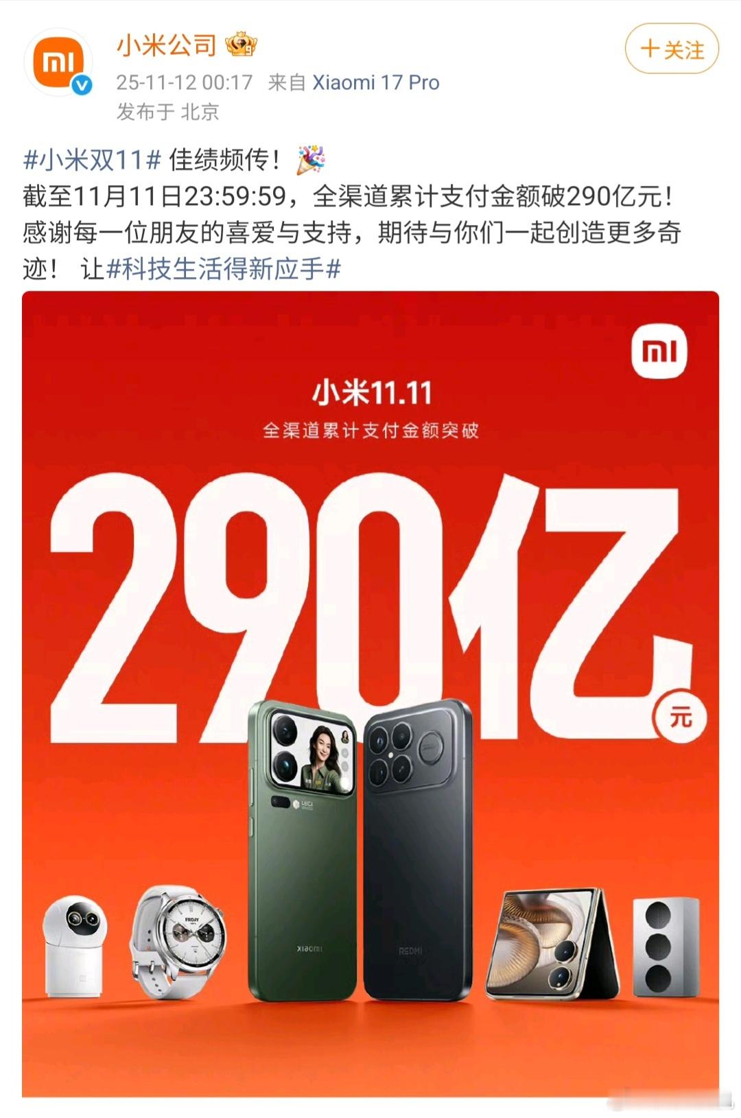 小米今年双十一累计支付金额突破290亿。你们今年有贡献吗