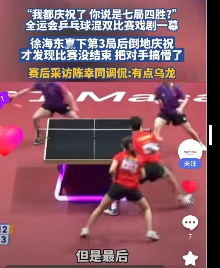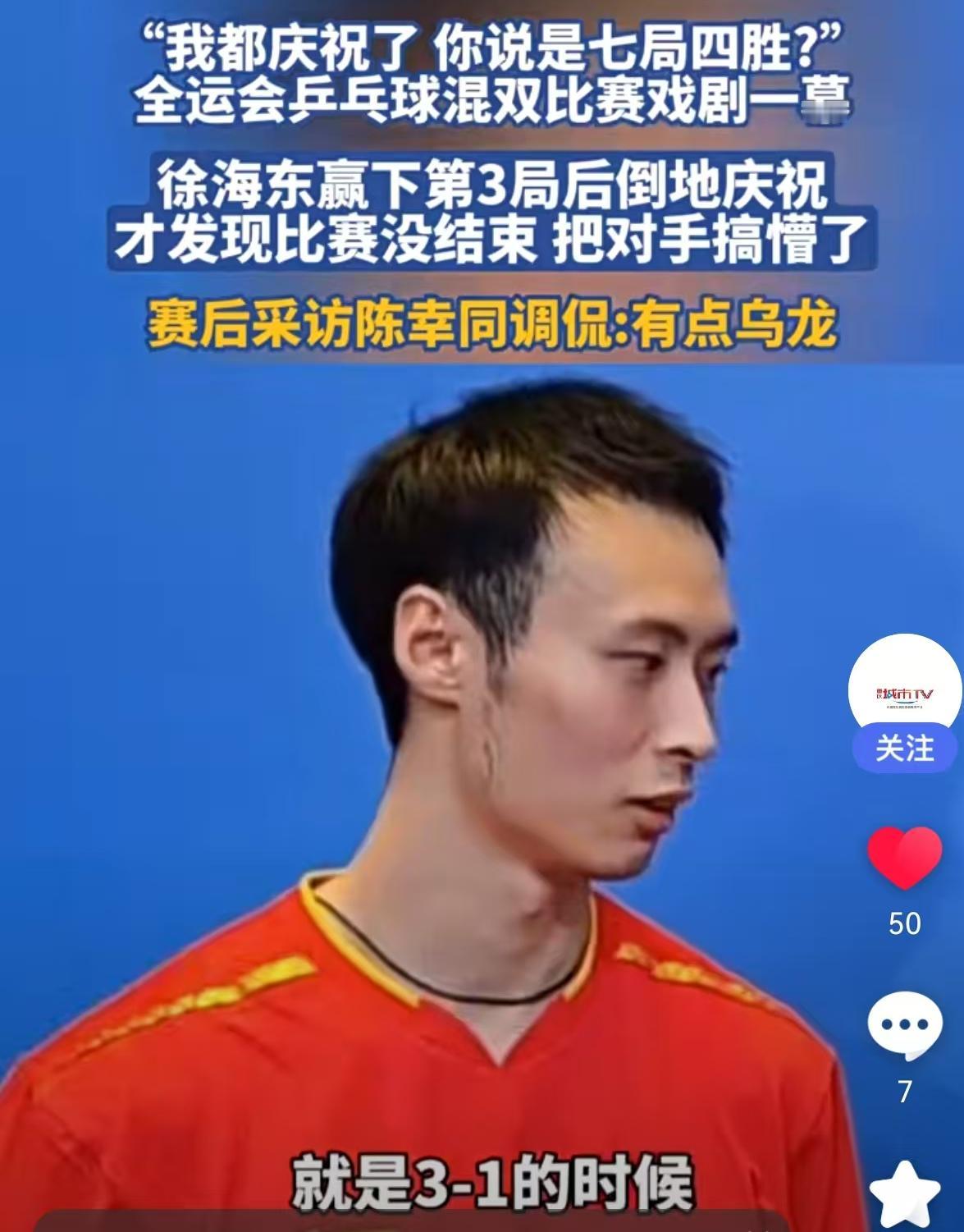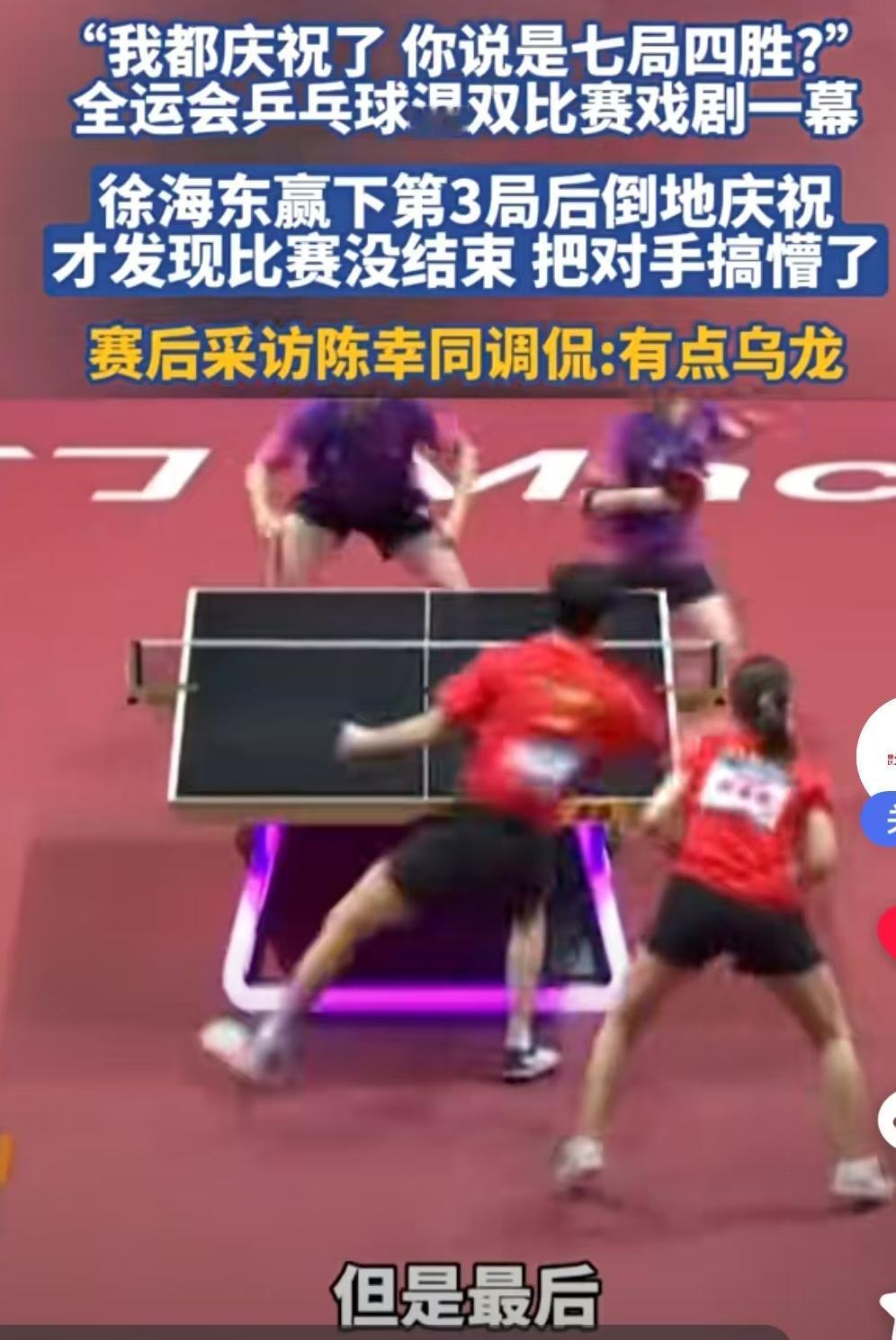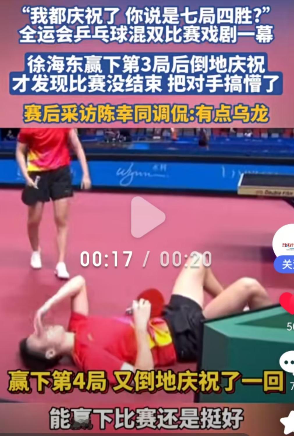 11月11日的全运会乒乓球赛场,上演了足以载入“赛场乌龙史册”的戏剧性一幕。当辽宁组合徐海东/陈幸同与香港搭档黄镇廷/杜凯琹的混双1/4决赛进行到白热化阶段时,一个令人啼笑皆非的瞬间,让所有人都愣住了。 当时,辽宁组合大比分2比1领先。第三局,徐海东和陈幸同配合默契,以11比7再下一城。拿下这一分后,徐海东突然扔掉球拍,一个后仰躺倒在地,双手指天,开始了狂喜的庆祝。他的队友陈幸同也跟着兴奋起来。对面的黄镇廷和杜凯琹显然被这突如其来的胜利宣言搞蒙了,下意识地走上前,准备握手认输。 一时间,场上场下陷入了一片混乱。就连经验丰富的央视解说员,也一度激动地宣布比赛结束。然而,裁判的哨声打破了这场“提前的狂欢”。他冷静地示意,比赛还没结束。徐海东的庆祝,成了一个“有点乌龙”的经典场面。 这场乌龙的根源,藏在一个赛制细节里。本届全运会的乒乓球混双比赛,规则有一个关键变化:从八强赛开始,比赛采用7局4胜制。而在此前的轮次,则是大家更为熟悉的5局3胜制。徐海东显然还停留在“赢三局就下班”的思维定式里,拿下第三局后,大脑自动判定比赛结束,于是便有了那记激情四射的倒地庆祝。 这个小小的误会,却像一面棱镜,折射出竞技体育中人性的多个侧面。我们看到了徐海东这位2000年出生于辽宁抚顺的年轻运动员,身上那股未经雕琢的纯粹与激情。他从6岁开始在抚顺体校挥拍,一路过关斩将,2016年进入国家二队,2018年升入一队,并在当年的世青赛上豪取男单、男双和男团三枚金牌。对于这样一位渴望胜利、拼尽全力的运动员来说,对胜利的渴望是如此强烈,以至于让他“提前”感受到了胜利的喜悦。这种庆祝,虽是乌龙,却无比真实。 同时,我们也看到了对手的风度。黄镇廷和杜凯琹在看到对手庆祝时,第一反应是准备上前祝贺。这是一种基于体育精神的默契与尊重,即便是在被“误导”的情况下,他们依然展现了职业运动员的素养。当裁判纠正后,他们迅速调整心态,重新投入比赛,没有让这个小插曲影响自己的竞技状态。 当然,这场小插曲也给所有人提了个醒:在高压的竞技环境中,信息的准确传达和规则的清晰掌握是多么重要。不仅是运动员,连教练、解说员都一度被带入“节奏”,这说明赛制变更带来的影响,比想象中要更微妙。对于观众而言,这也是一次生动的“规则科普课”。原来,全运会这样的国内顶级赛事,其赛制会根据不同阶段进行动态调整,而运动员在场上分秒必争的激烈对抗中,保持清醒的头脑和对规则的绝对清晰,是除了技术之外,另一项至关重要的能力。 最终,这场充满波折的比赛以辽宁组合4比1获胜告终。具体的五局比分是11-9, 5-11, 11-7, 11-8, 14-12。徐海东的乌龙庆祝,没有影响最终的结局,反而为这场紧张激烈的比赛增添了一抹轻松的色彩。赛后他坦言“有点乌龙”,四个字,尽显年轻人的可爱与坦诚。 这个瞬间,或许比一场完美的胜利更能让人记住。它告诉我们,体育不只是冰冷的比分和精准的技术,它充满了人的情感、失误与真实。徐海东的这次“提前庆祝”,非但没有成为笑柄,反而让我们看到了一个更立体、更鲜活的运动员形象。它提醒我们,在追求更高、更快、更强的道路上,那些不完美的、充满人情味的瞬间,同样闪耀着动人的光芒。这或许就是体育的魅力所在,它不仅考验技艺,也映照人心。 以上内容仅供参考和借鉴