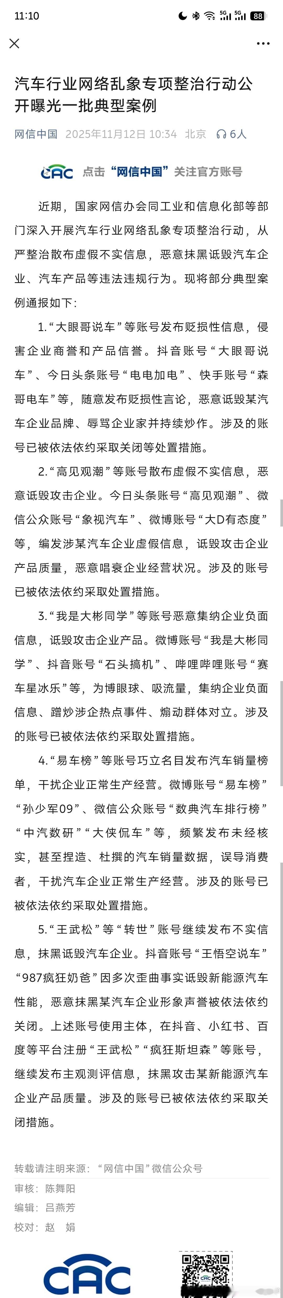 网信中国出公告了,涉嫌一大批账号谨言慎行,为正能量发声,如果自媒体人有不对可以合理批评,不要攻击车企,应该是接下来的主流保护舆论环境就是保护新能源制造业,这个是国家的大方向大方针所以只要越界,就会被收拾
