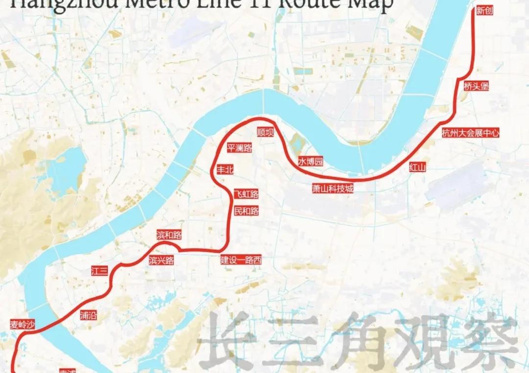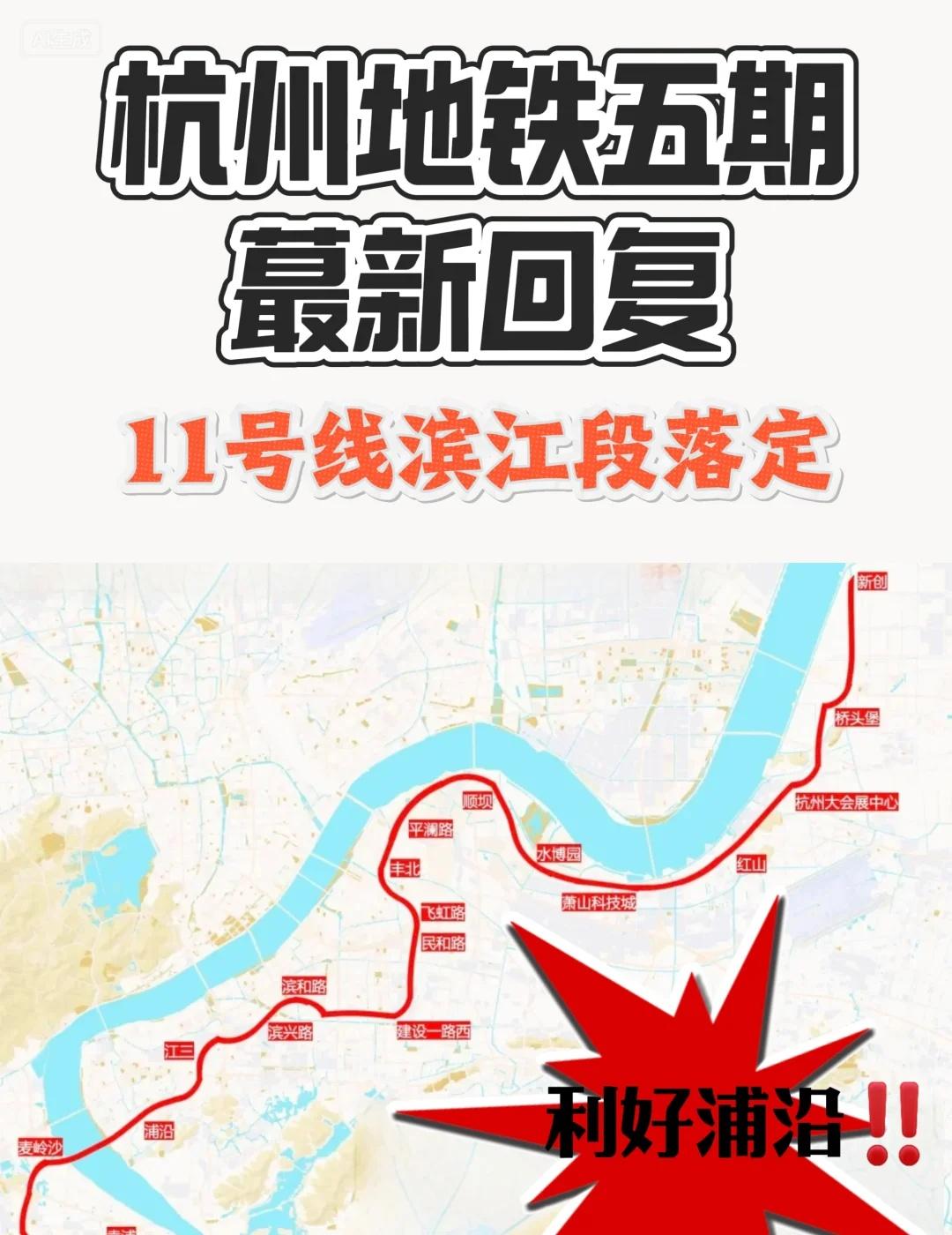 🚇杭州地铁五期Zui新回复!11号线新进展 杭州地铁11号线迎来新动态!线路预计东起钱塘河庄,西至西湖双浦,重磅串联钱江世纪城、滨江核心区与之江板块。 最大亮点在滨江段✅: 区里已明确将其列为2025年重点工作,全力推进纳入地铁五期规划。规划显示,滨江段长约13.8公里,拟设8个站点,将有效弥补浦沿等区域的轨交空白。 在滨江区段,规划11号线初步考虑沿东冠路、信诚路、滨安路、江虹路、滨和路等道路敷设。 一旦建成,将极大方便滨江两岸通勤,强化区域联动。打算在滨江置业的朋友,可以重点关注这条线的进展! 杭州地铁 城市规划 滨江发展 地铁11号线 浦沿
