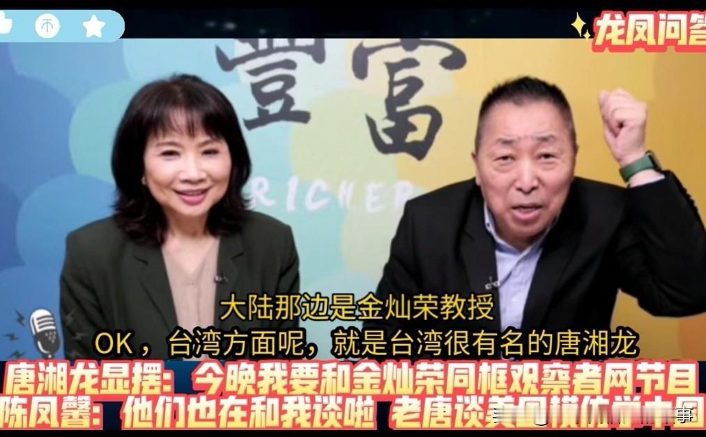 唐湘龙和金灿荣同框翟翾节目《两岸圆桌派》!期待! 在今天的《东南西北龙凤配》节目上,唐湘龙官宣他今天晚上将和金灿荣教授同框出现在【观察者网】主办、翟翾主持的《两岸圆桌派》节目上,让网友对翟翾昨天打哑迷的来宾的纷纷猜测顿时有了答案。 《两岸圆桌派》前两期请了高志凯教授和蔡正元博士,收视很不错,不过最近蔡正元因为骂郑丽文被广大网友诟病。陈凤馨也透露,观察者网也在和她洽谈节目事宜。 期待金灿荣和唐湘龙的今晚同框火花。
