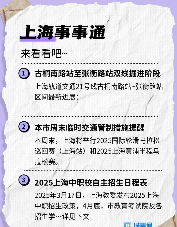 🔥今日城市热门资讯盘点🔥来看三大城市热点! 「新进展!轨道交通21号线古桐南路站(原高斯路站)~张衡路站区间进入双线掘进阶段」 「本周末,本市这些道路将采取临时交通管制措施→」 「2025上海中职校自主招生日程表」 1️⃣新进展!轨道交通21号线古桐南路站(原高斯路站)~张衡路站区间进入双线掘进阶段 🔻标志性里程碑事件:古桐南路站~张衡路站区间上行线启用新型承插式管片盾构机,正式进入双线掘进阶段,标志着项目取得重要进展。 🔻施工内容概述:项目包含两站两区间,采用总长约1790米的新型预埋承插式管片。施工位于张江高科地区,涉及盾构区间和两个站点。 🔻施工优化和监控:施工单位针对地质条件和管片特点优化施工方案,确保拼装精度和环向CT件对接。实时监测数据变化,加强动态管控,保证施工质量。 🔻高质量施工保障:重点监督环向CT件和纵向连接螺杆对接、密封垫安装等关键工序,确保承插式管片的高质量施工成果。古张区间将在有序掘进中向市民展现更多交通便利。 2️⃣本周末,本市这些道路将采取临时交通管制措施→ 本周末,上海将举行2025国际轮滑马拉松巡回赛(上海站)和2025上海黄浦半程马拉松赛。为确保赛事顺利举办,上海市公安局黄浦分局决定实施临时交通管制措施。具体措施包括禁止多条道路车辆和行人通行,如滇池路、宁波路、南京东路、九江路等。周六至周日,部分道路将实行禁行。此外,轮滑马拉松和路跑半程马拉松的赛道沿中山东一、二路等路线,涉及的地点包括外滩金牛广场、人民路、龙华东路等。在活动举办期间,市民需留意交通管制时间和路线,尽量避开受影响的道路,以确保自身出行顺利。 3️⃣2025上海中职校自主招生日程表 2025年3月17日,上海教委发布2025上海中职招生政策,4月底,市教育考试院及各招生学校公布中职校自主招生章程;5月10-30日,中职校自主招生面试或专业测试,具体详见下表。 🔹2025上海中职校自主招生日程表 🔹2025年上海市中等职业学校自主招生工作实施日程表 🔹2025年上海市全日制普通中等职业学校自主招收来沪人员随迁子女工作日程表 🙌关注城小通账号,或🔍搜索城事通进入频道,了解更多城市动态!