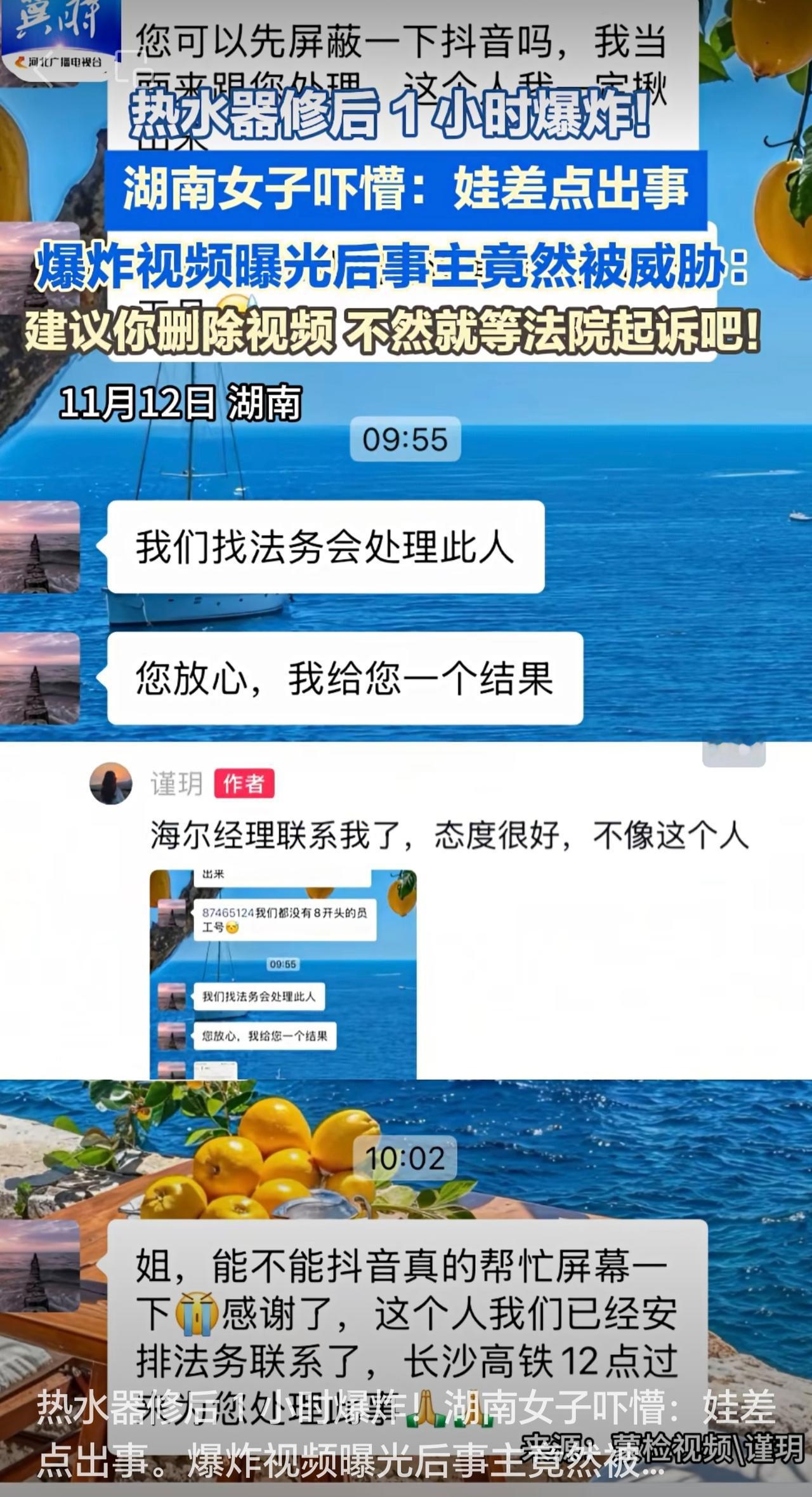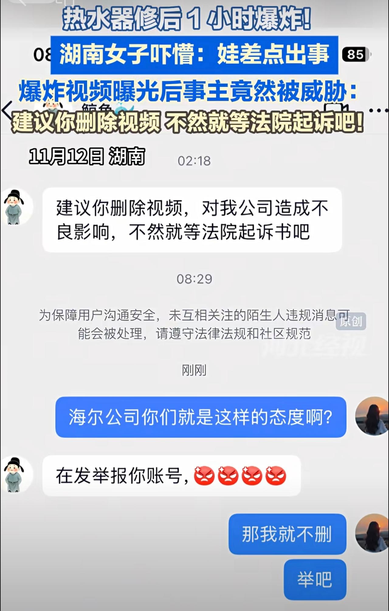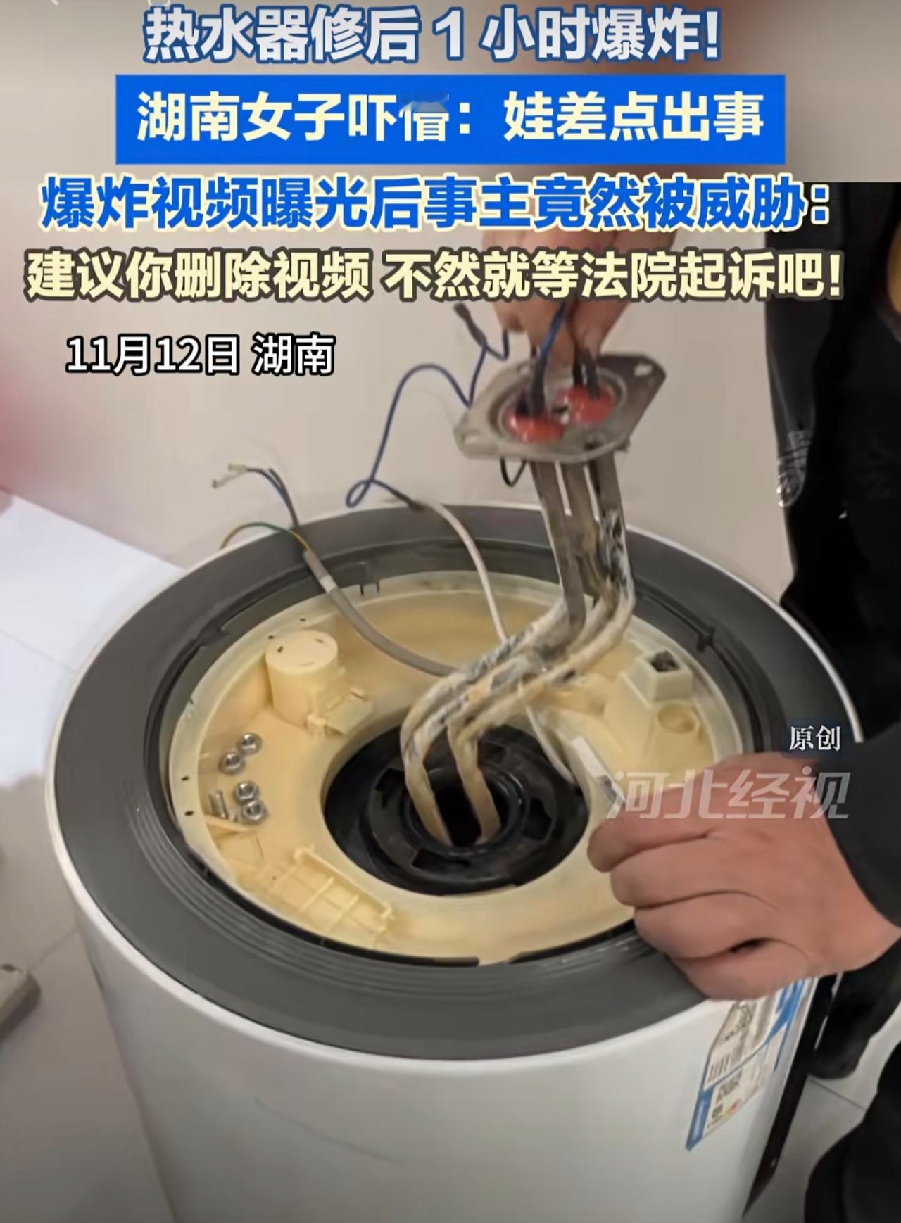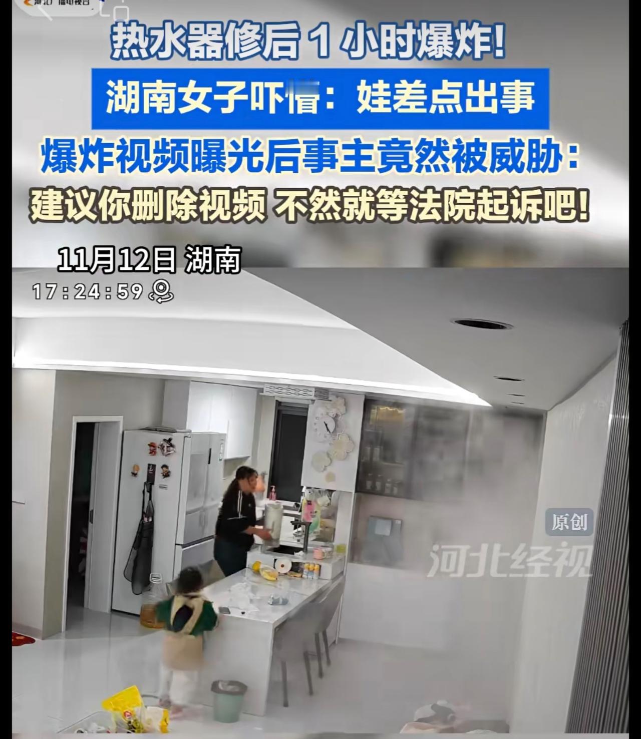 热水器修后 1 小时爆炸!湖南女子吓懵:娃差点出事。爆炸视频曝光后事主竟然被威胁:“建议你删除视频,不然就等法院起诉吧。”