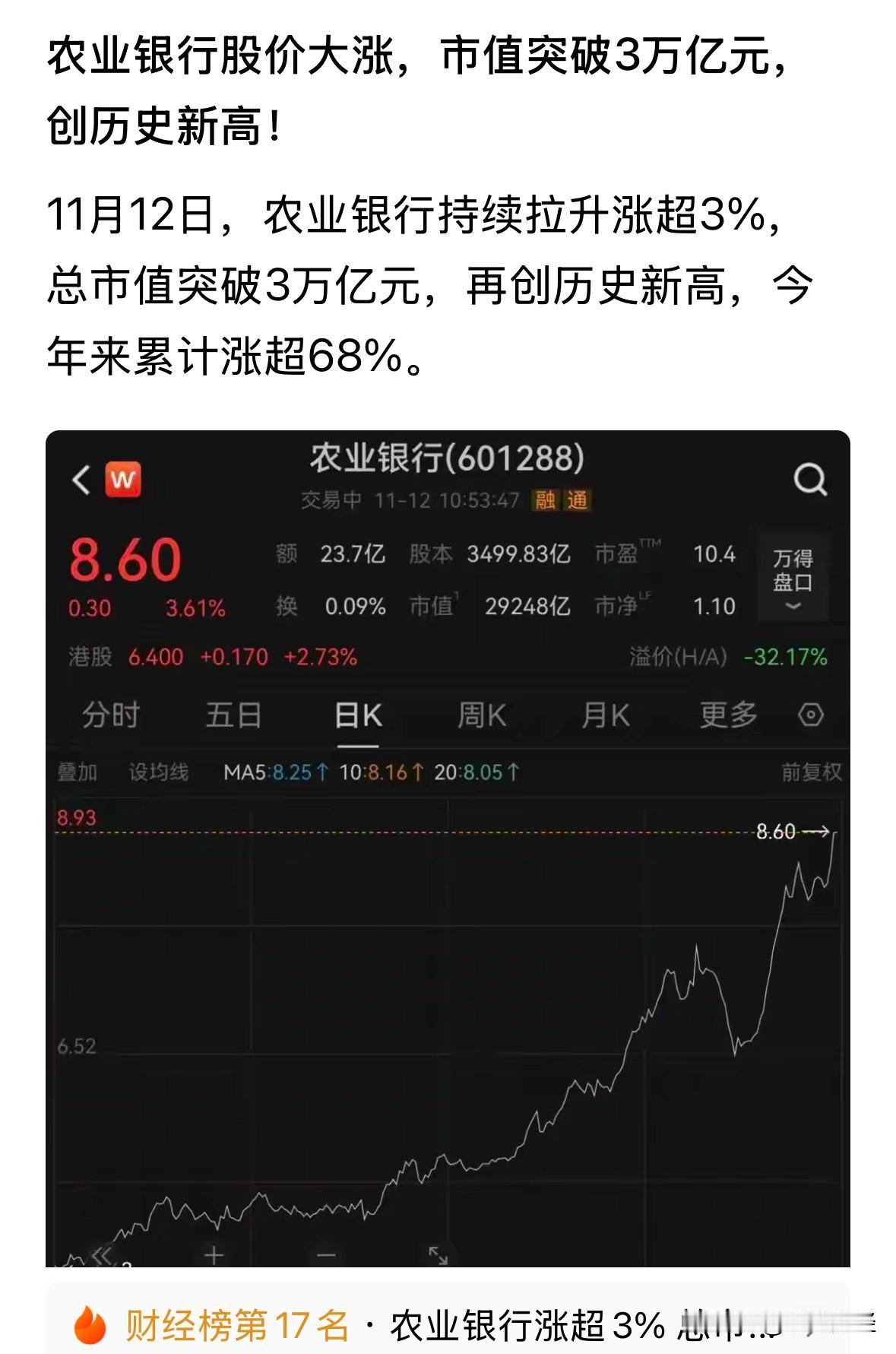 当年的贵茅没有实现的3万亿元的市值梦想,现在由农业银行代劳了!就问你服气不服气? 年初至今累涨超68%,俨然是大象起舞,万象更新! 市盈率已超10倍,这在银行股中应该算高的了,至少比招商行、兴业银行高得多。 下一步是不是应该轮到券商板块呢?! 毕竟券商股是业绩较之更富弹性吧?!