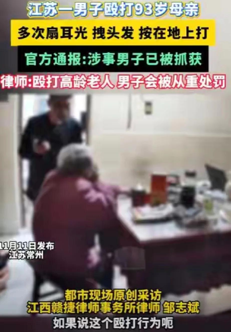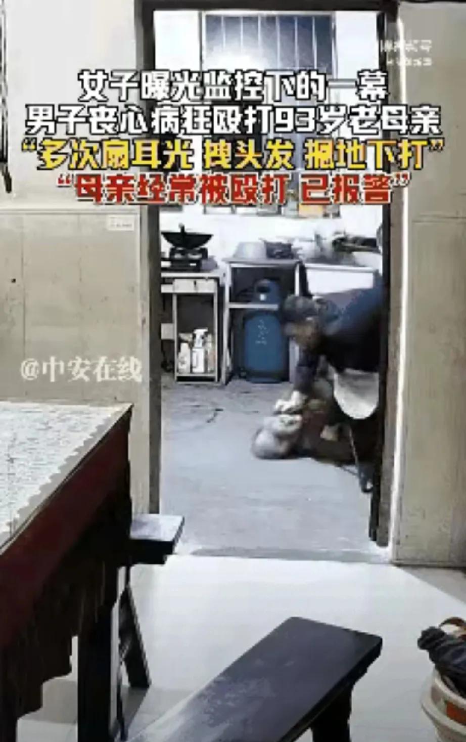 江苏50岁男子暴打93岁母亲事件令人发指!11月10日监控视频显示,杨某中因母亲索要5元买食物,竟深夜对白发苍苍的母亲扇耳光、拽头发、拳打脚踢,老人蜷缩在地哀嚎求饶。视频曝光后全网震怒,央媒紧急发声谴责"突破人伦底线"。 警方已刑拘杨某中,其行为涉嫌虐待罪与故意伤害罪。律师指出,93岁高龄受害者属法定从重情节,若伤情达轻伤以上,刑期或超3年。更令人心寒的是,女儿证实母亲长期遭虐,老人"举手格挡"动作暴露习惯性恐惧。 这记耳光打碎的不仅是亲情,更是五千年孝文化根基!网友怒斥:"连母亲5元活命钱都吝惜,枉披人皮!"目前老人已送医,案件侦办中。天道轮回,法律绝不会轻饶这种丧尽天良之徒!! 殴打古稀老人 广东老人被打