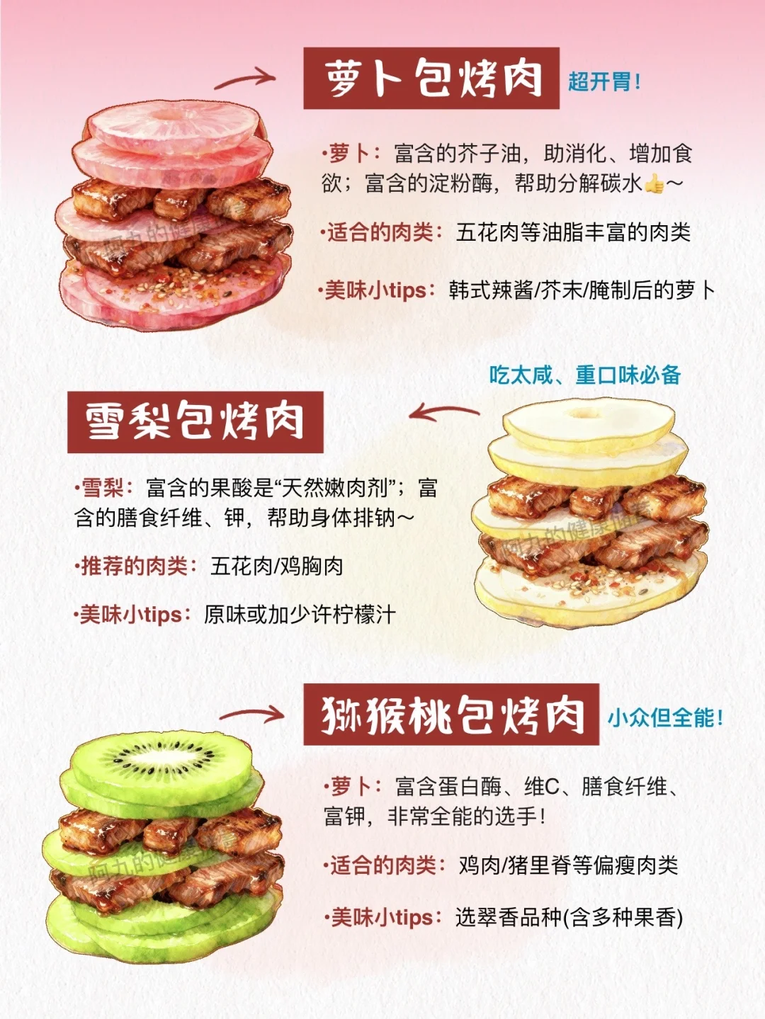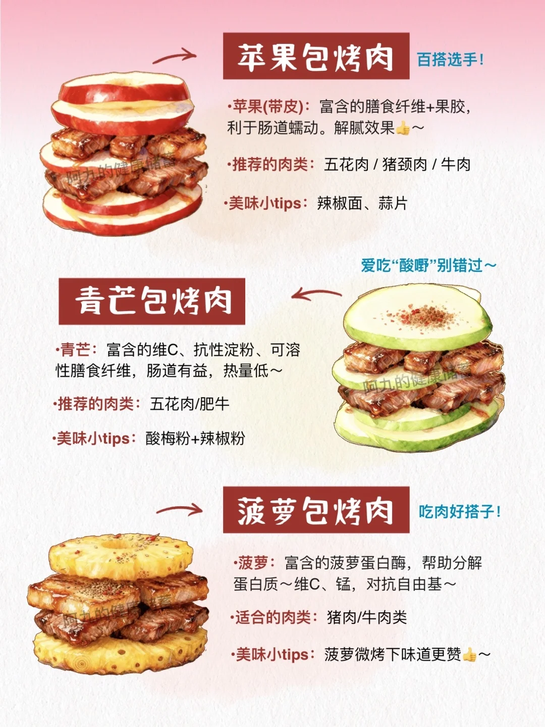 当你开始尝试解构水果包烤肉, [举手R]恭喜你发现了吃烤肉的新世界(新玩法[庆祝R])[鼓掌R] 第一次尝试菠萝包烤肉, 真的就惊艳到我了! 这种吃法不仅味道好, 还有很多健康益处[得意R](像富含蛋白酶的水果,简直就是烤肉搭子吖!) 让烤肉变得不那么单调了,新奇又有趣[大笑R] 分享6款超经典的吃法, 每一种都很绝! 一定要试试看~ 哪一种是你的菜呢[喝奶茶R]