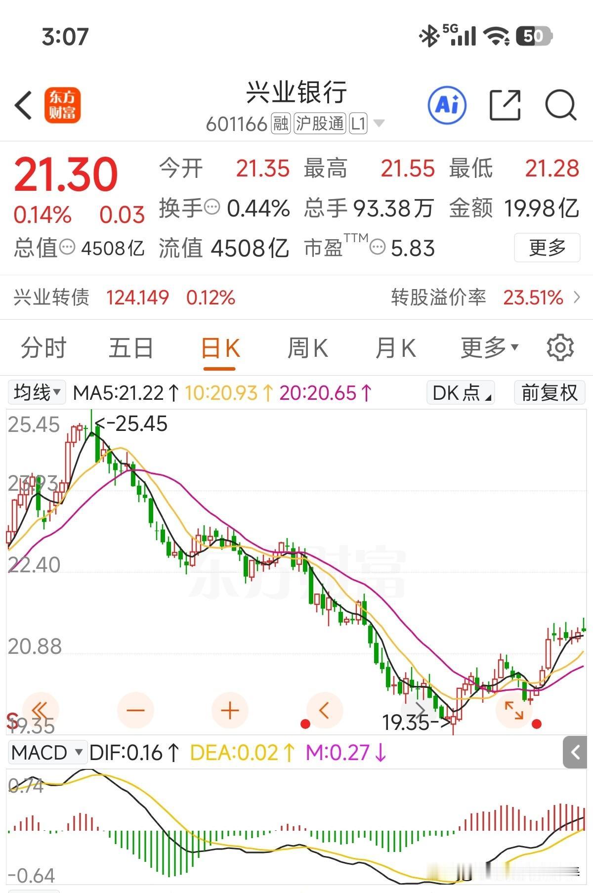 连续6个交易日小区间震荡了,要变盘了! 看看隔壁的农行,市值破3万亿,市净率1.1了,渣渣兴目前市净率也就0.57! 农业银行已城头立木,剩下股份行、城商行看下有哪位猛将敢跟上一把,修复银行股估值!