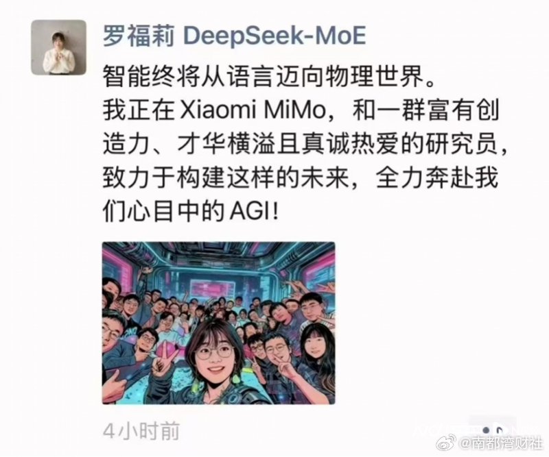 【雷军以千万年薪招揽?】11月12日,有消息称,罗福莉在朋友圈发文:“智能终将从语言迈向物理世界。我正在Xiaomi MiMo,和一群富有创造力、才华横溢且真诚热爱的研究员,致力于构建这样的未来,全力奔赴我们心目中的AGI。”南都N视频记者从知情人士处了解获悉,目前罗福莉已入职小米。今年10月,小米AI团队携手北京大学联合发布了一篇聚焦MoE与强化学习的论文。在该论文中,此前因DeepSeek而爆火的AI人才罗福莉的姓名就在其中。公开资料显示,罗福莉本科毕业于北京师范大学计算机专业,硕士阶段进入北京大学计算语言学深造。硕士毕业后,罗福莉加入阿里巴巴达摩院,担任机器智能实验室研究员,负责开发多语言预训练模型VECO,并推动AliceMind项目的开源工作。2022年,罗福莉加入DeepSeek母公司幻方量化从事深度学习相关工作,后又担任DeepSeek的深度学习研究员,参与研发DeepSeek-V2等模型。此前有消息称,小米创始人雷军以千万年薪招揽DeepSeek开源大模型DeepSeek-V2的关键开发者之一罗福莉,领导小米AI大模型团队。当时有消息称,小米公司正在积极搭建自己的GPU万卡集群,以加大对AI大模型的投入力度。小米大模型团队在成立之初就已拥有6500张GPU资源,而此次搭建GPU万卡集群,将进一步提升小米在AI大模型领域的研发实力。据知情人士透露,该计划已经实施数月之久,雷军在其中扮演了重要的领导角色。不过,当时小米并未给出回应,罗福莉本人也未直接回应此事。今年4月30日,小米开源了首个为推理(Reasoning)而生的大模型“Xiaomi MiMo”,联动预训练到后训练,全面提升推理能力;随后在5月30日,小米开源了多模态大模型Xiaomi MiMo-VL,称该模型为Agent时代而来;8月8日多模态模型Xiaomi MiMo-VL实现更新,推理、文档、GUI、视频理解能力大幅提升,支持思考模式切换;9月19日小米开源首个原生端到端语音大模型Xiaomi-MiMo-Audio。总体看来,小米今年在大模型上的进展速度越来越快,在各大模态上都进行了布局。南都N视频APP · 政商数据