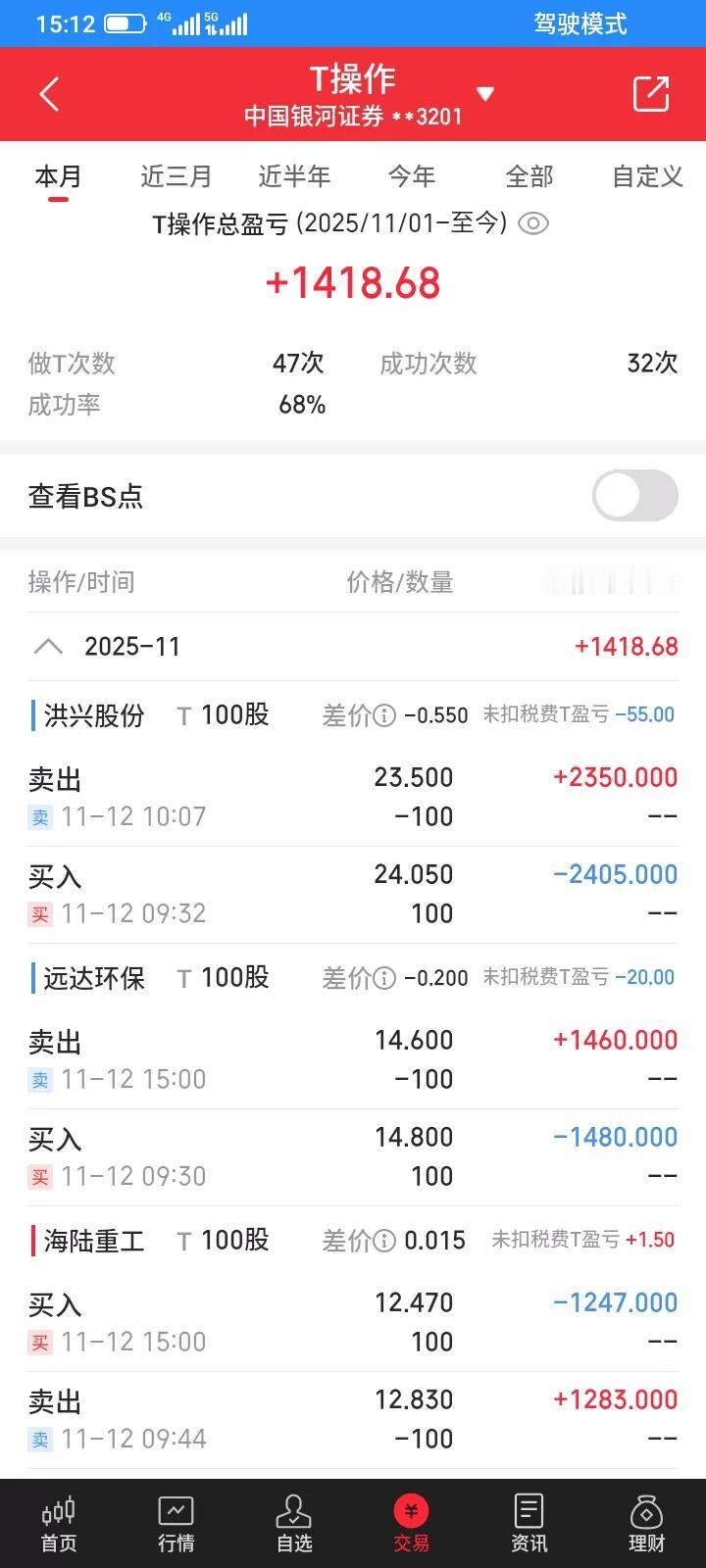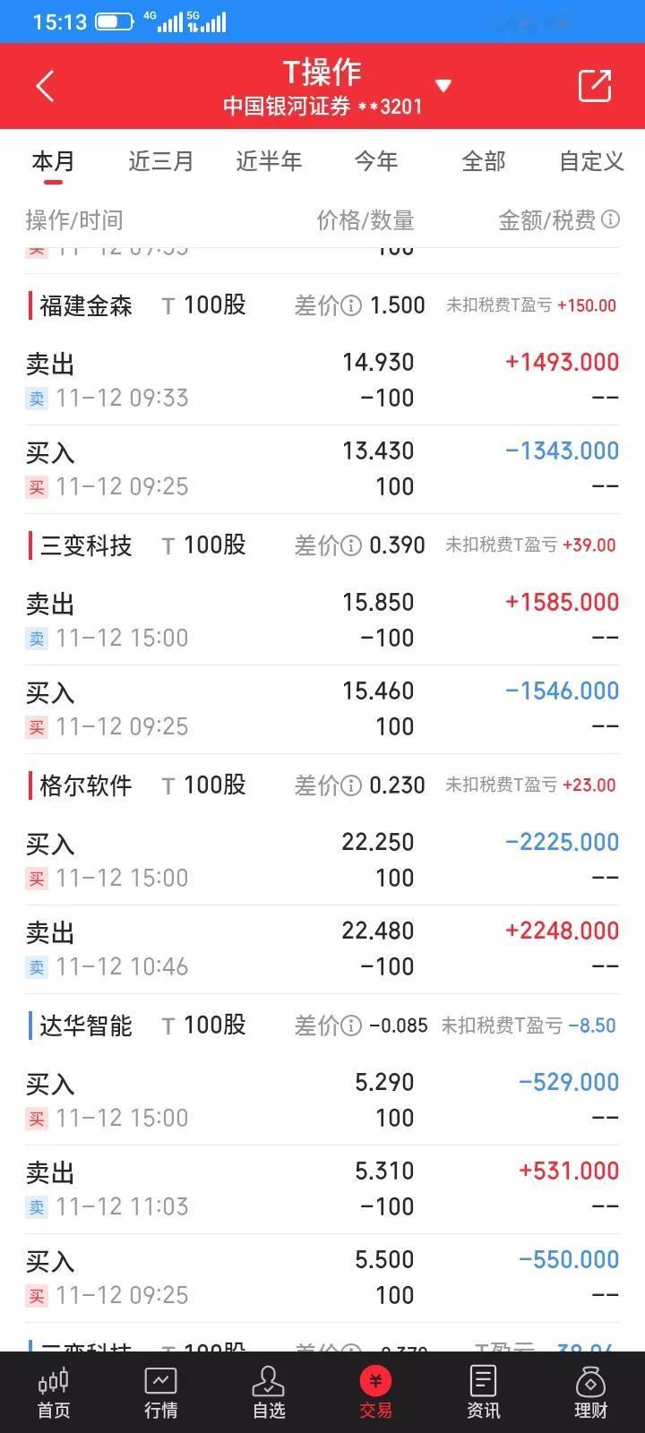 2025.11.12,今天t了100股洪兴股份,亏了55元,t了100股远达环保,亏了20块钱,t了100股海陆重工,赚1.5块钱,实际是亏了33元,t了100股福建金森,赚150元,t了100股三变科技,赚39元,t了100股格尔软件,赚23块钱,t了100股达华智能,亏了8.5元,实际亏了19元,一共卖出的金额是10950元,做t赚85元,印花税是5.48元,佣金1块多 ,净赚77元,也好,今天总体亏钱,但是降低了持股成本。今后反弹的时候就赚得多一点了。